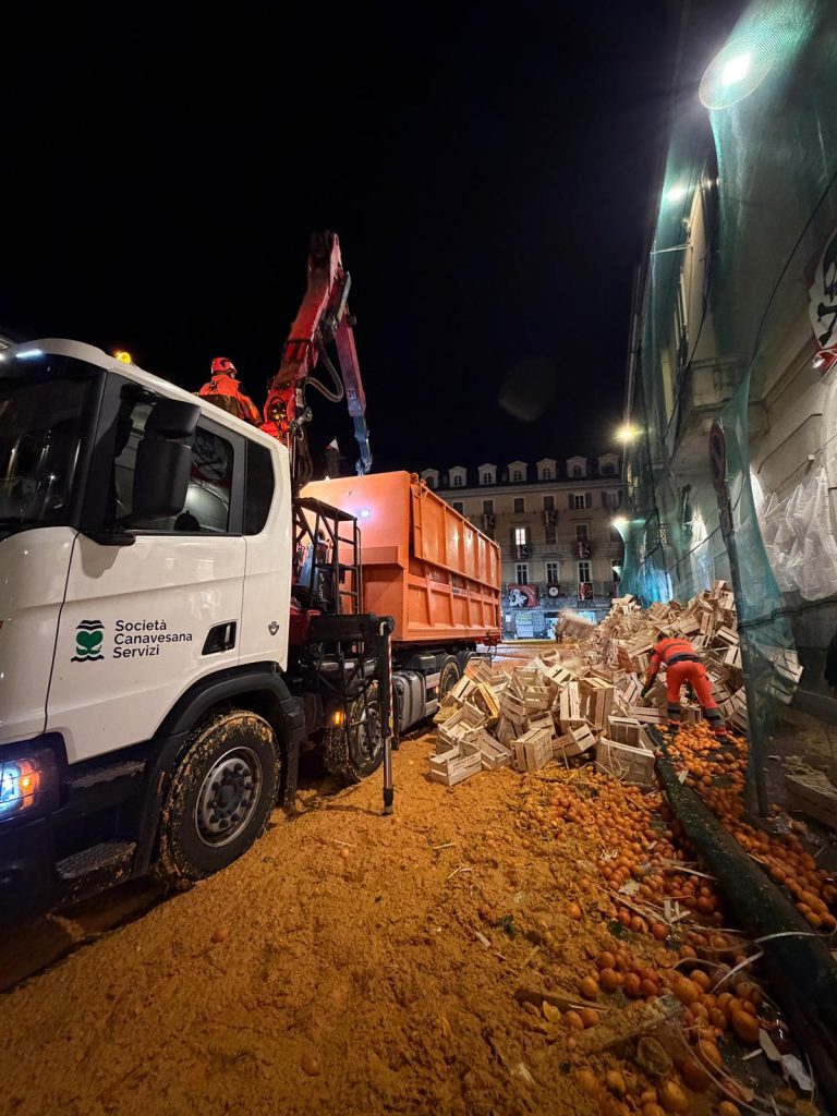 “Per Società Canavesana Servizi – spiega il Presidente Calogero Terranova – è un momento atteso e concitato, in cui un evento straordinario per impegno, logistica e organizzazione deve coesistere con la routine quotidiana dei servizi svolti nei nostri Comuni. Viene vissuto come il vero banco di prova della nostra Azienda, partecipato, programmato e, finalmente vissuto, in cui ognuno mette le proprie capacità e competenze e investe energie e risorse per far fare bella figura al proprio territorio. Investiamo tanto in termini di numero di addetti, di mezzi impiegati, di ore lavoro e di fatica, ma il risultato, possiamo dirci senza timore, è stato davvero superiore alle aspettative. Ogni anno ci sembra di avere sempre meno tempo per ripristinare gli spazi cittadini, viste anche le numerose e bellissime manifestazioni collaterali che si sviluppano prima e dopo la battaglia, ma siamo stati davvero in grado di battere tutti i tempi record. Piazza di Città il martedì sera era pronta per lo scarlo in 1 ora esatta e, così, tutte le altre piazze di conseguenza”.