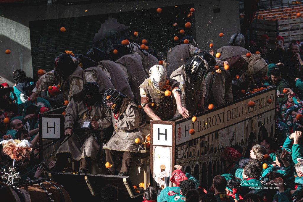 Nel frattempo, il fragore delle arance ha riempito le piazze: aranceri a piedi e carri da getto si sono confrontati con passione e rispetto, regalando, come sempre, uno spettacolo emozionante e potente, ancor più valorizzato da una giornata finalmente calda e soleggiata.