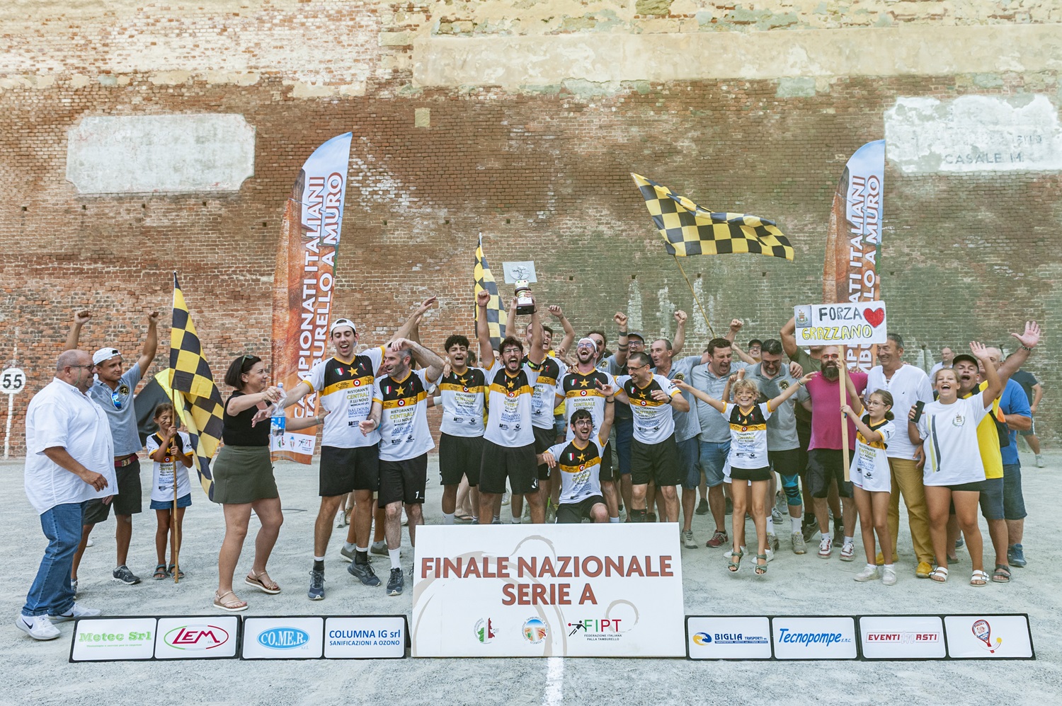 Lo Sferisterio “Cesare Porro” di Vignale Monferrato, dinanzi un numeroso pubblico delle grandi occasioni, ha incoronato ieri la formazione del Grazzano come vincitrice dello Scudetto 2024 del Tamburello a Muro dopo aver superato per 19-6 (e oltre tre ore di sfida) i contendenti del Portacomaro.