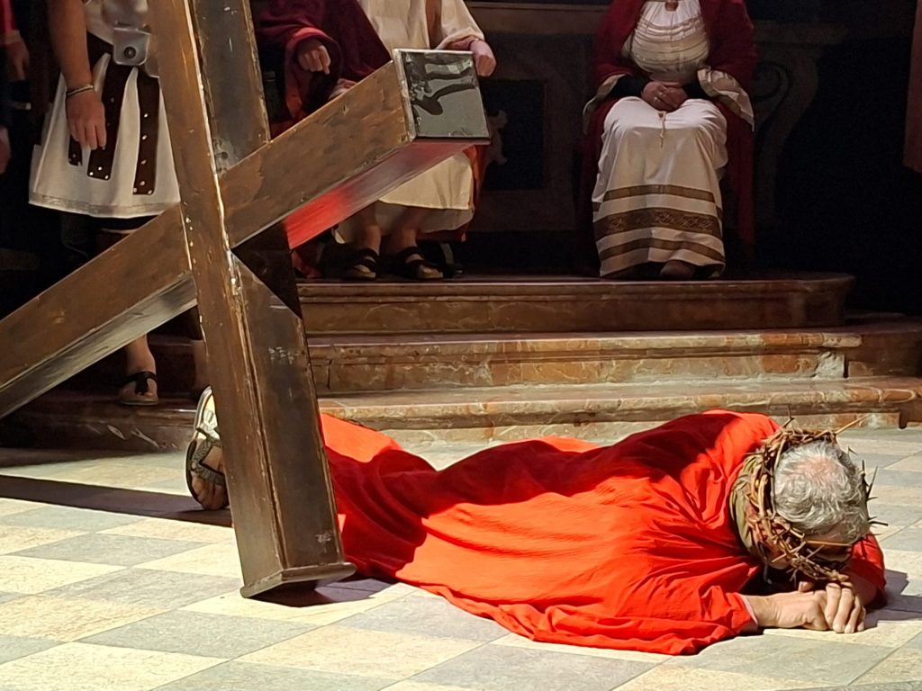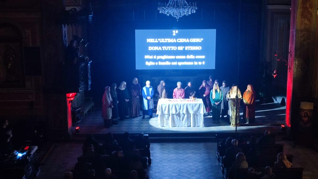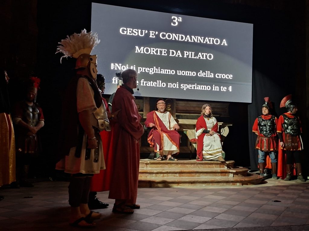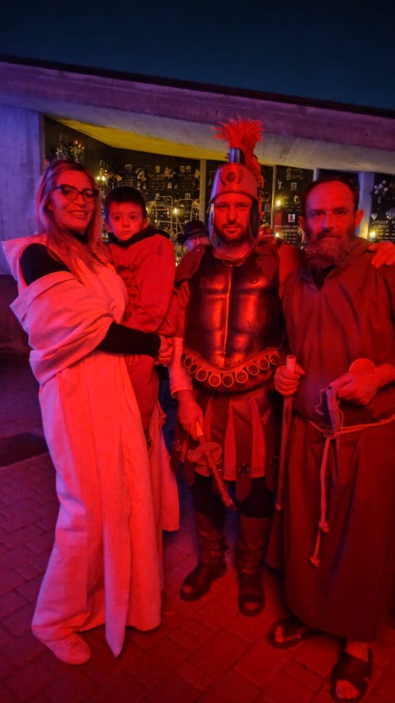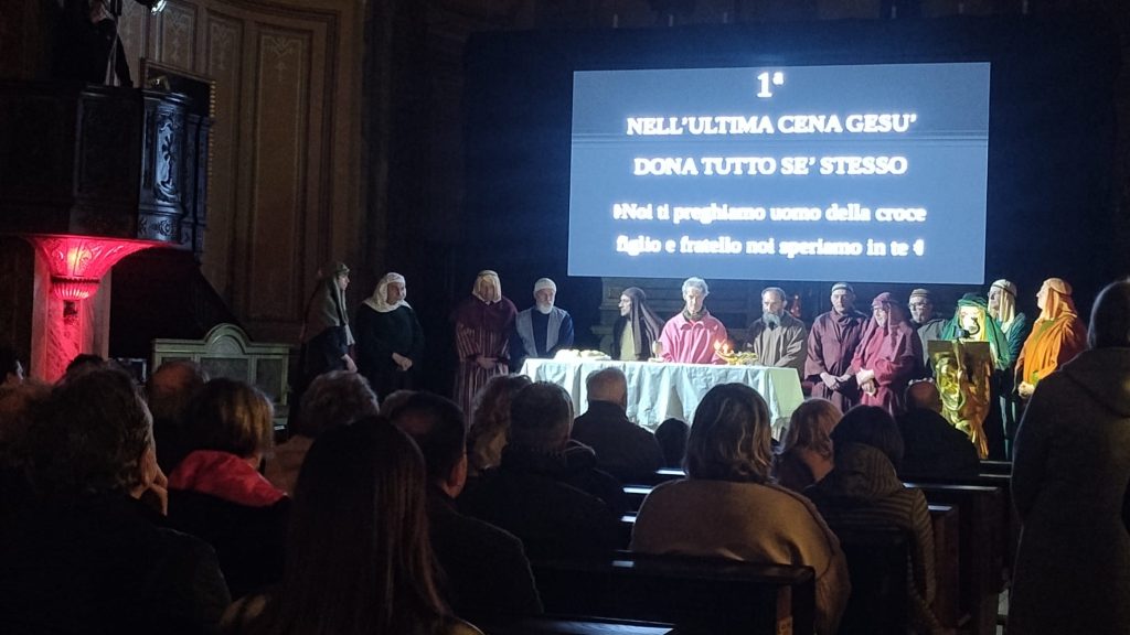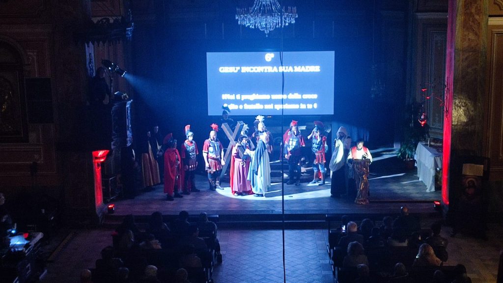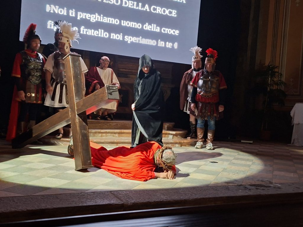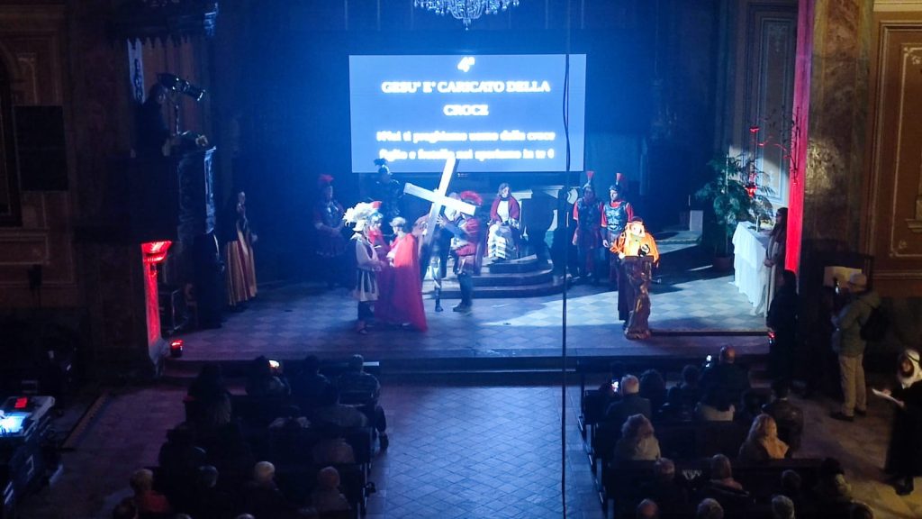 Questa rappresentazione, che è la preghiera della Via Crucis, si è svolta in chiesa e si è conclusa con la processione al cimitero con la statua del Cristo morto.