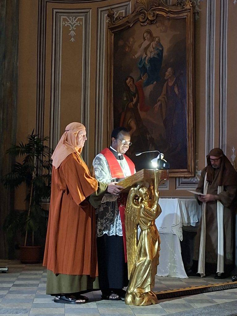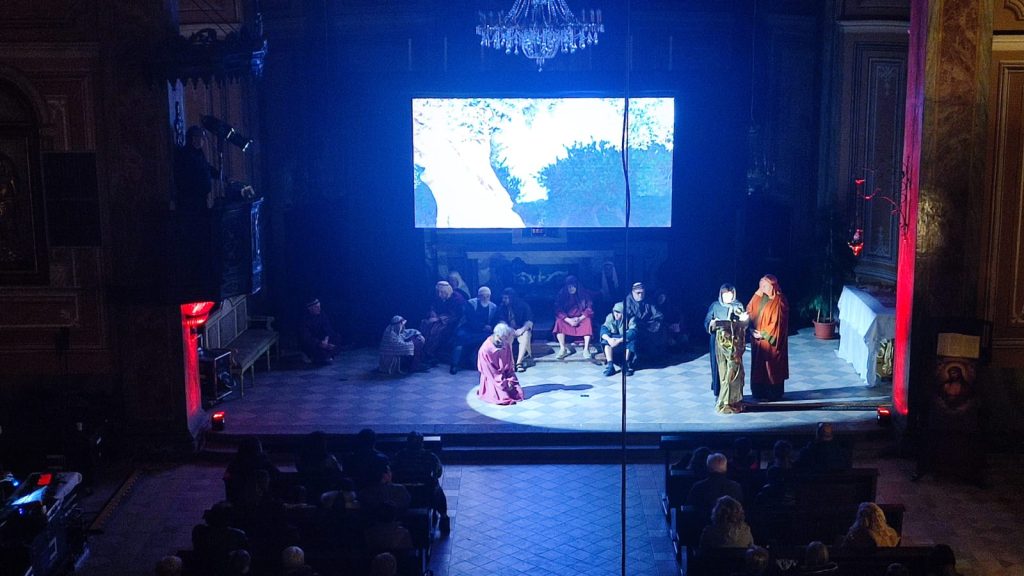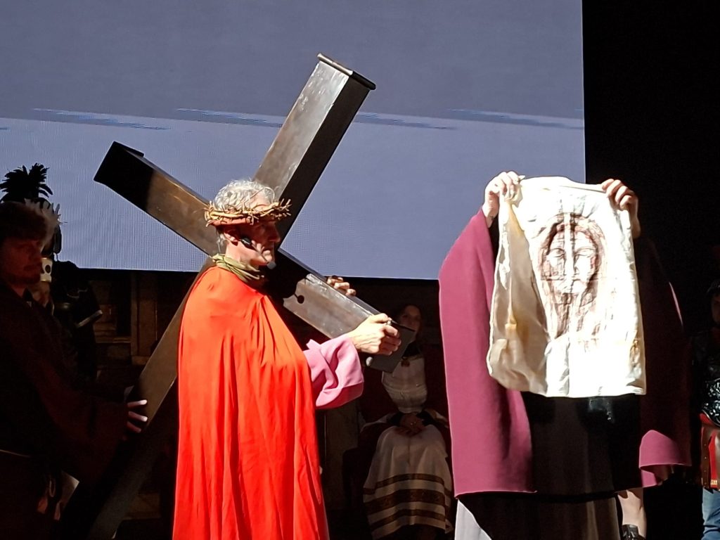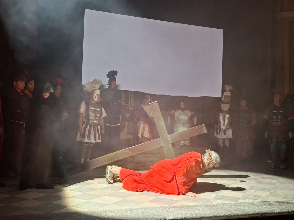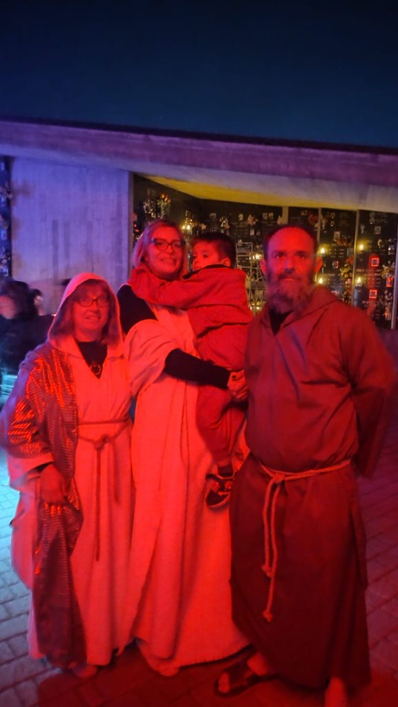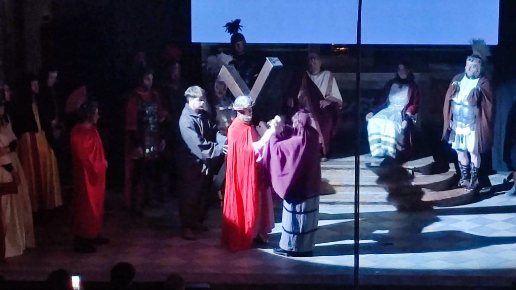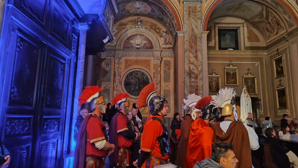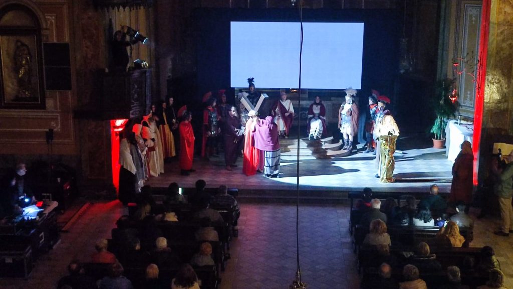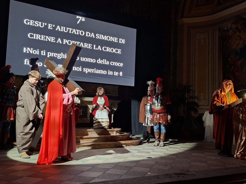 Questa rappresentazione, che è la preghiera della Via Crucis, si è svolta in chiesa e si è conclusa con la processione al cimitero con la statua del Cristo morto.