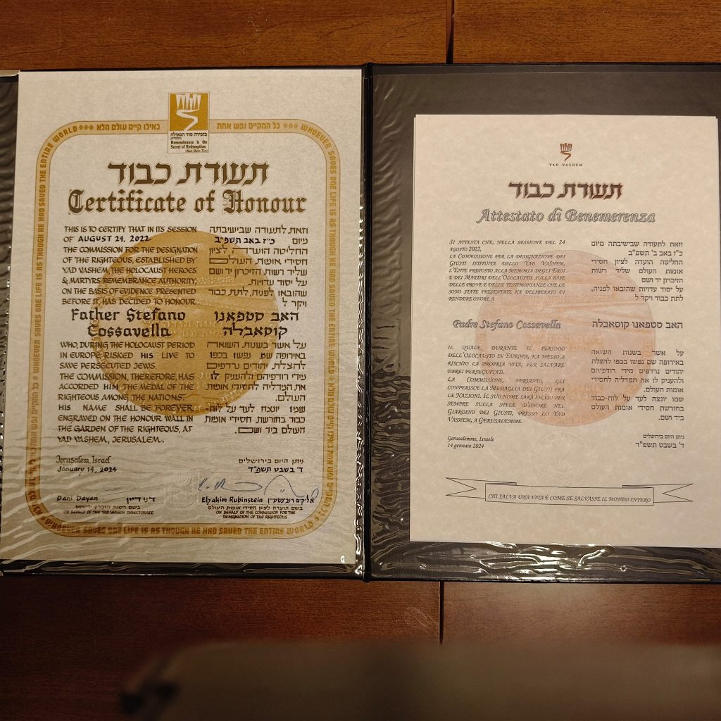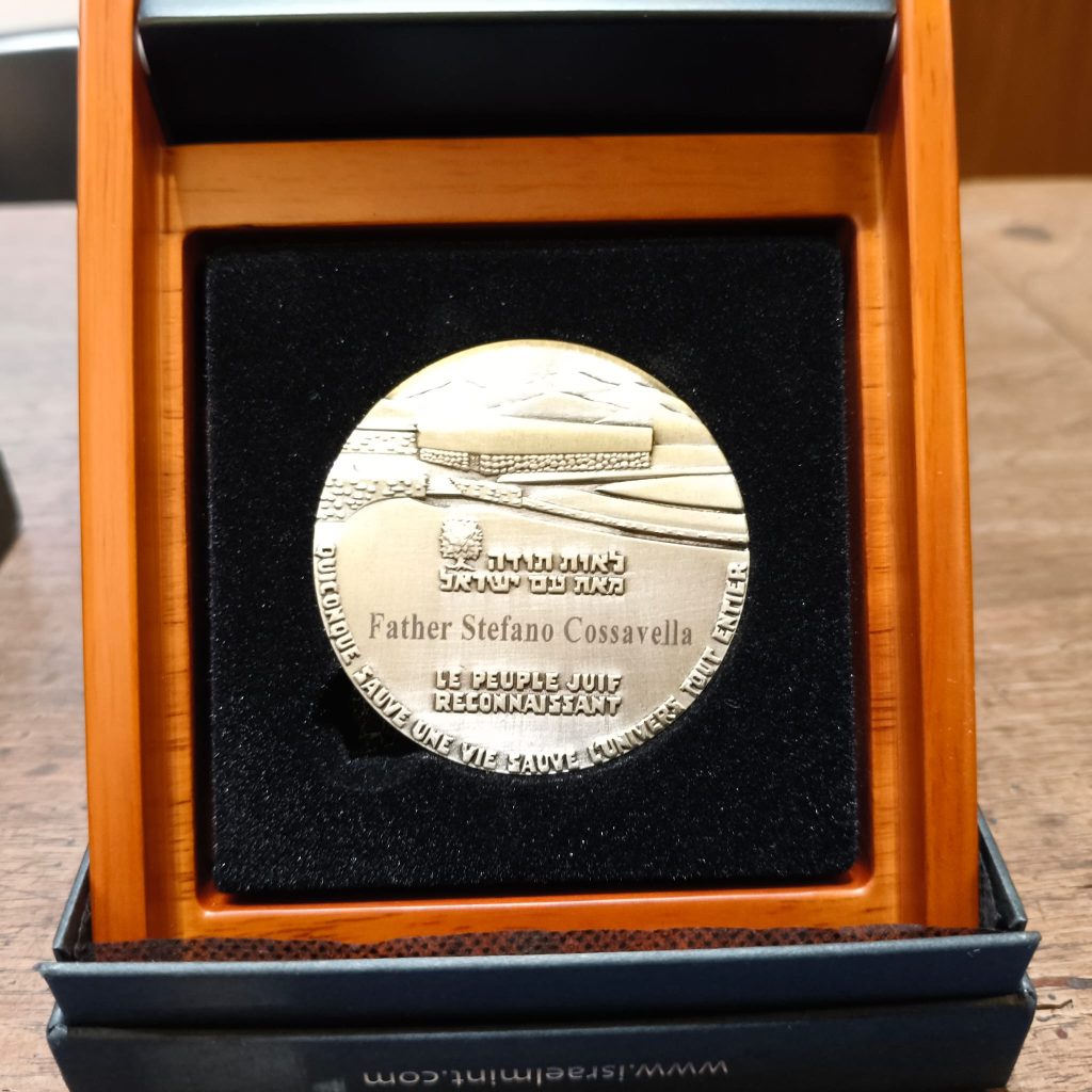 Ebbene, in quella occasione potemmo riferire di un fatto certamente importante e significativo, come il conferimento dell’onorificenza di “Giusto tra le Nazioni” di cui Don Cossavella è statp insignito dallo Yad va – Shem (Un nome eterno; da Isaia, 56,5), l’istituzione israeliana che rende onore a tutti i non ebrei che, negli anni della folle persecuzione, corsero gravi rischi per mettere in salvo ebrei loro connazionali.