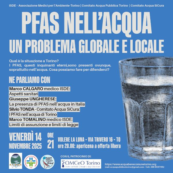 Si terrà presso Volere la Luna, Via Trivero 16 a Torino, venerdì 14 novembre alle ore 21.00, un incontro su “PFAS nell’acqua: un problema globale e locale”.