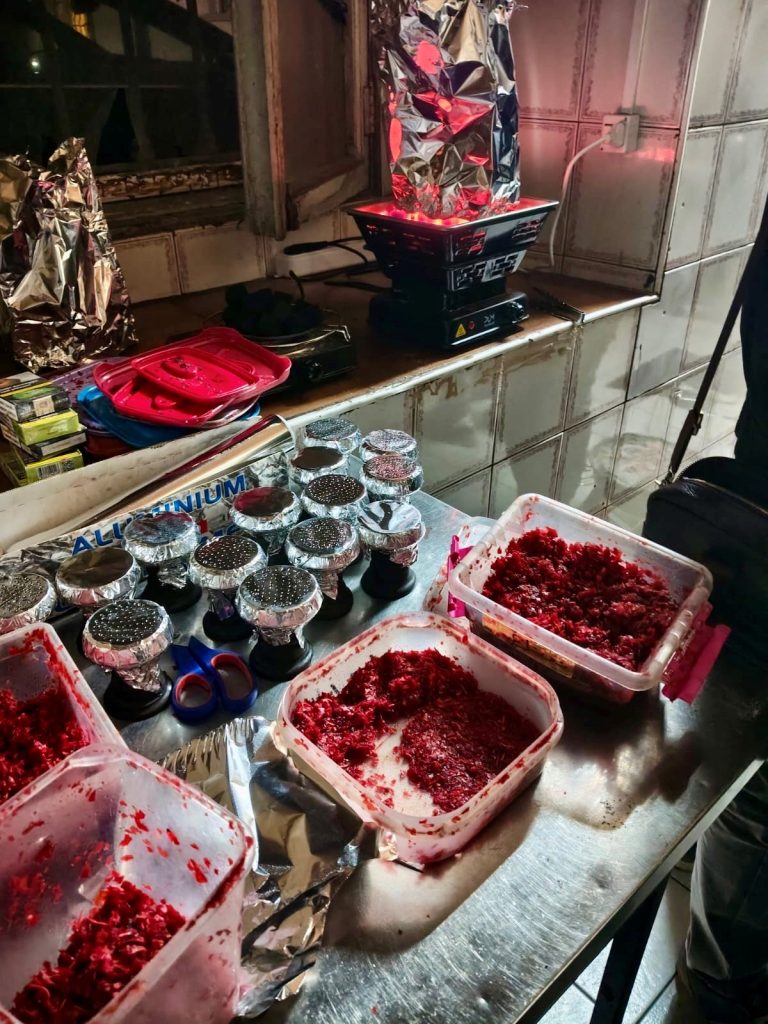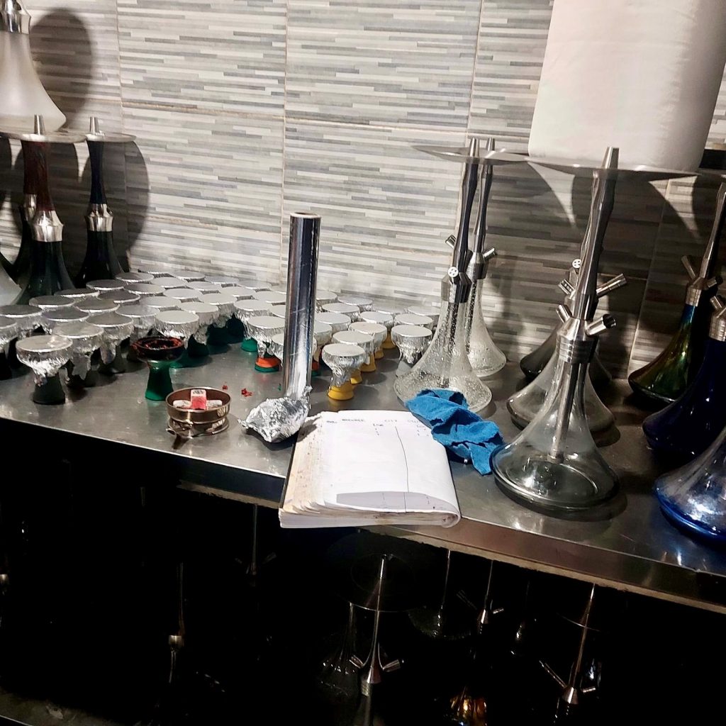 I clienti possono osservare la preparazione del narghilè, che include la scelta del tabacco, la sua disposizione nella testa del narghilè e l’aggiunta di aromi come menta o frutta. Questo processo è considerato un vero e proprio rito.