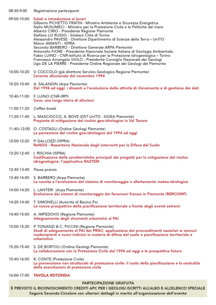 Tra i relatori figurano il direttore del Dipartimento di Scienze della Terra, Alessandro Pavese, Marco Amanti dell’ISPRA, il direttore generale dell’ARPA Piemonte, Secondo Barbero, il presidente della Società Italiana di Geologia Ambientale, Antonello Fiore, Fabio Luino dell’Istituto di Ricerca per la Protezione Idrogeologica, il presidente del Consiglio Nazionale dei Geologi, Francesco Arcangelo Violo, il presidente dell’Ordine Regionale dei Geologi del Piemonte, Ugo De La Pierre. Vincenzo Coccolo, già direttore del Servizio Geologico della Regione Piemonte, terrà una relazione sull’evento alluvionale del novembre 1994, mentre gli altri interventi tecnici saranno dedicati ai dissesti e all’evoluzione delle attività di rilevamento e di gestione dei dati; alla storia delle alluvioni del Tanaro a Ceva e alle proposte di mitigazione del rischio geo-idrologico in Valle Tanaro; all’evoluzione della percezione del rischio geo-idrologico dal 1994 ad oggi; al Repertorio Nazionale degli interventi per la Difesa del Suolo; alla codificazione delle caratteristiche principali dei progetti per la mitigazione del rischio idrogeologico grazie all’applicativo RASTEM; alla nascita e all’evoluzione del sistema di monitoraggio e allertamento meteo-idrologico, all’evoluzione dei sistemi di monitoraggio dei fenomeni franosi in Piemonte; alle nuove prospettive della pianificazione territoriale a fronte degli eventi estremi; all’adeguamento degli strumenti urbanistici al Piano di Assetto Idrogeologico; all’applicazione dei provvedimenti cautelari ai Comuni inadempienti e ai nuovi indirizzi in materia di difesa del suolo e pianificazione territoriale ed urbanistica; alla collaborazione tra l’Ordine dei Geologi del Piemonte e la Protezione Civile dal 1994 ad oggi; alla prevenzione non strutturale di protezione civile, con un’attenzione particolare al ruolo della pianificazione e alla centralità delle esercitazioni di protezione civile.