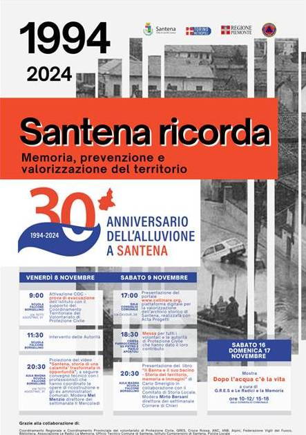 Da venerdì 8 a domenica 17 novembre il Comune di Santena, con il patrocinio della Regione Piemonte e della Città metropolitana di Torino, organizza invece una serie di eventi per commemorare l’alluvione, promuovere la cultura della prevenzione e riflettere sulle scelte che hanno trasformato il territorio.