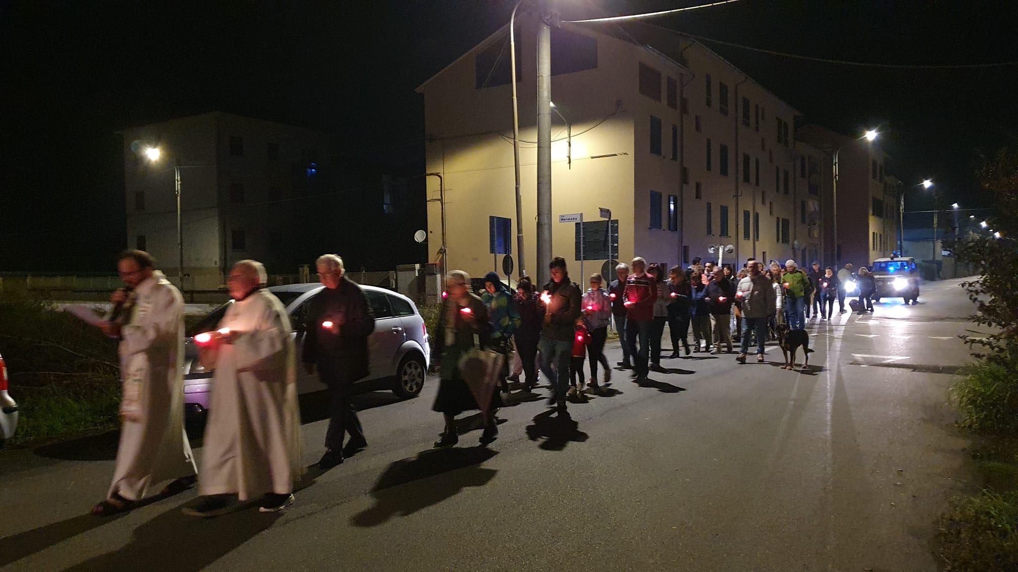 Il corposo “fiume” di persone, guidato dal parroco don Patrizio Maggioni e don Riccardo Leone, coadiuvati da Giancarlo Tione, con in mano i lumini accesi (la fiamma: è il simbolo della vita, del razionalismo e della libertà) e in preghiera, si è snodato in Via Montello, via Duca d’Aosta, C.so Italia, fino a giungere sotto l’atrio comunale.