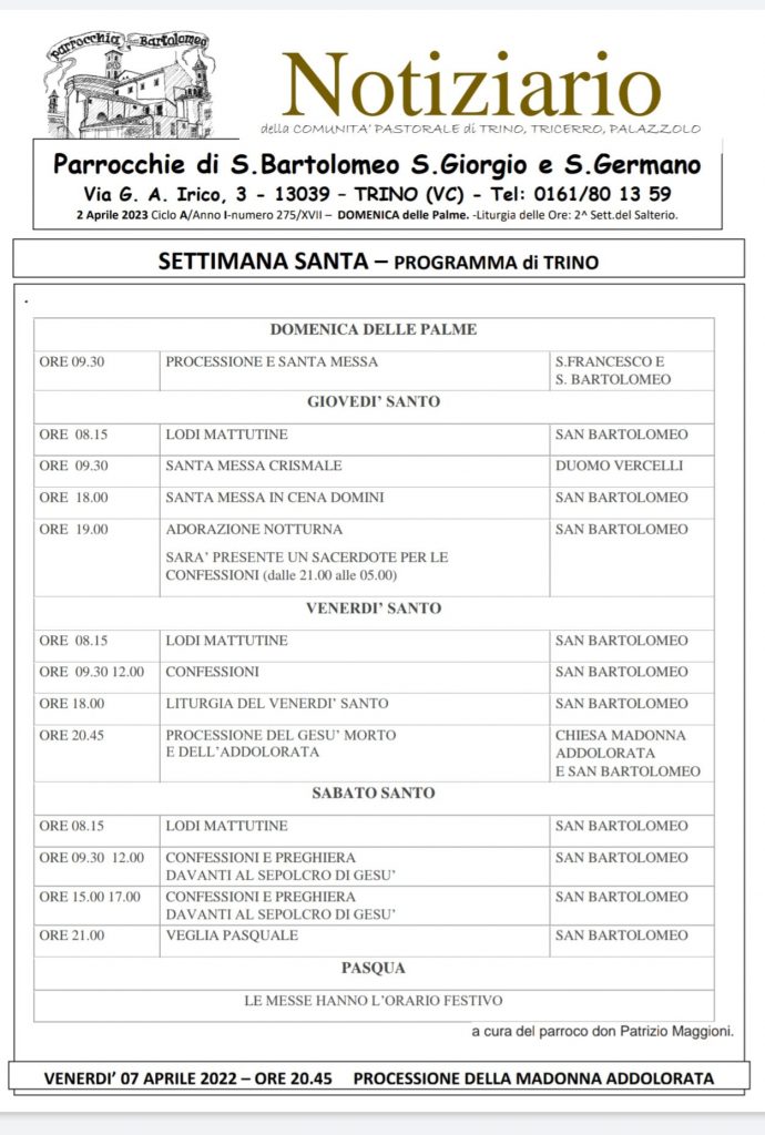 A seguire verrà ricordato il venerdì Santo, giornata in cui si ricorda Gesù in Croce. A Trino, alle 20,45, avrà luogo per le vie della città la Processione del Gesù morto con al seguito la Madonna Addolorata. Sabato Santo, giorno di silenzio e di attesa con Veglia pasquale e infine la Domenica di Pasqua, momento di gioia, Gesù ritorna in vita e gli Angeli annunciano la sua resurrezione, il sepolcro è vuoto!