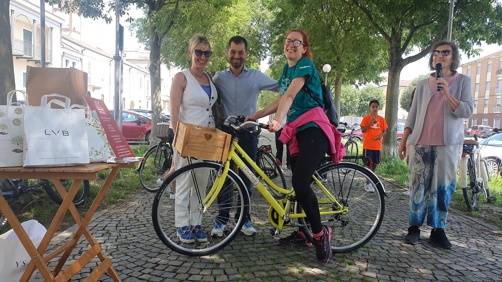Ad attendere il gruppo, a Trino, in Piazza Garibaldi, gli Assessori Alberto Mocca e Teresa Alvino, che hanno posato per la foto con la spumeggiante Vera Viancino, fortunata detentrice del biglietto estratto e che tutta soddisfatta e felice ha subito provato il nuovo mezzo.