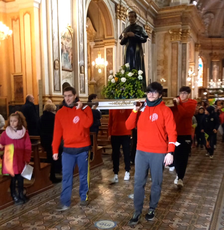 Al termine della Celebrazione Eucaristica, i bravi Animatori hanno sollevato la statua di don Bosco e accompagnati dal canto “Giù dai colli”, l’hanno portata in processione.
