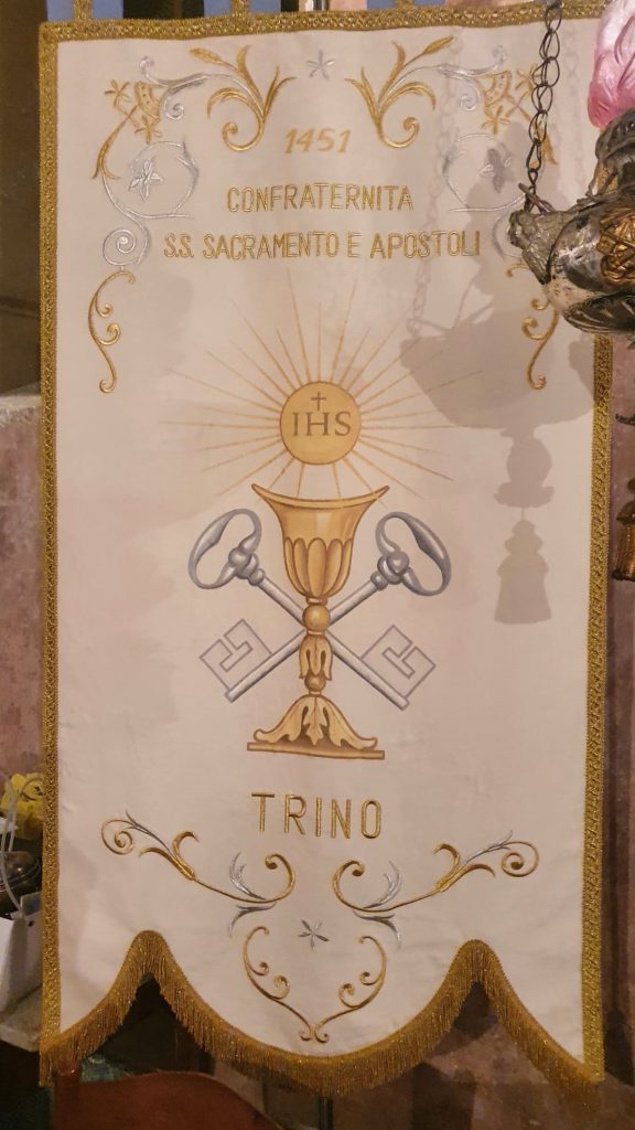 (marilisa frison) – La Confraternita del SS. Sacramento e Apostoli, di Trino ha felicemente festeggiato, dopo diversi anni, i Santi Pietro e Paolo ieri, 29 giugno, nell’omonima chiesa, adiacente alla parrocchiale con ingresso dall’antico “monte dei pegni”, dove in cima alla lunga scalinata in pietra, al primo piano, si trova questa preziosa chiesetta con opere d’arte degne di nota.