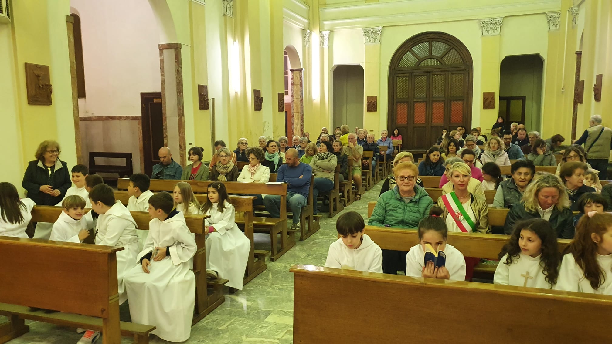 I bambini della Prima Comunione, che indossavano il loro saio candido, occupavano le prime fila di banchi, a far le veci del Sindaco con fascia, nella sua prima uscita pubblica, la neo eletta Assessore al Commercio e all’Istruzione, Maria Teresa Alvino, il sempre presente “Gruppo Alpini Trino”, la banda musicale cittadina “Giuseppe Verdi” e molti rappresentanti di Associazioni varie.