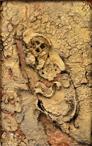 Infine, fonde in conglomerati materiali plastici e vinavil, al fine di creare una superficie costellata di relitti che richiamano echi di vita personale; sedimenti geologici ricreati, rifiniti con le sfumature delle terre naturali e con colate di resina lucida e brillantinata, dagli effetti strabilianti.