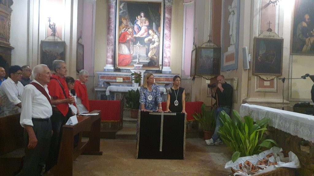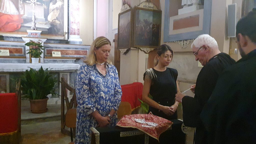 Con l’imposizione del collare con le insegne della venerabile Arciconfraternita di Orazione e Morte, sono state accolte da tutti i Confratelli nella chiesa e nominate Madrine della festa di San Camillo de Lellis, protettore dell’Arciconfraternita: Minchilli Francesca e Scaruffi Cristina.