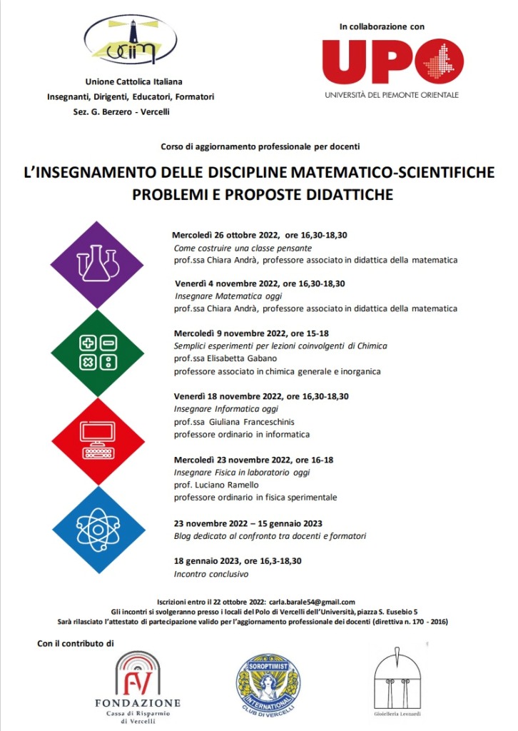 La sezione UCIIM di Vercelli ha organizzato un corso di aggiornamento rivolto ai docenti delle materie matematico-scientifiche, in particolare matematica, informatica, fisica, chimica.