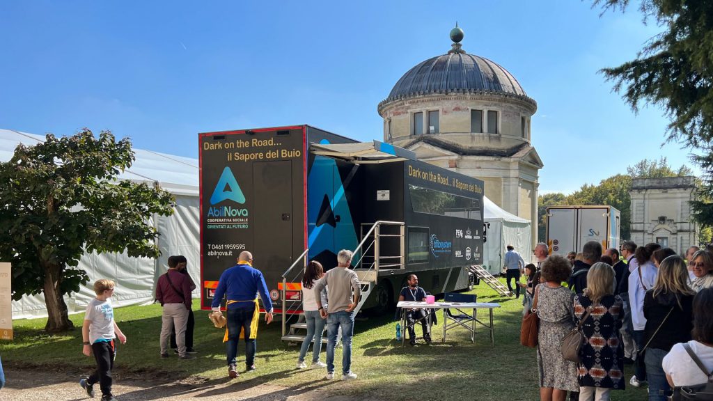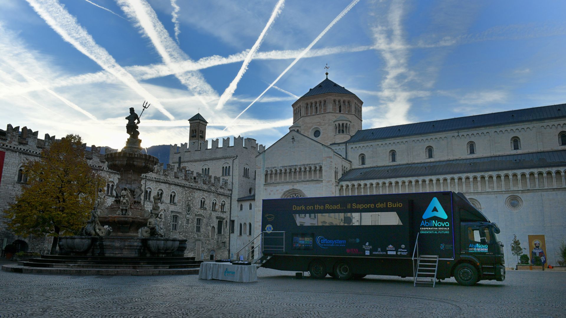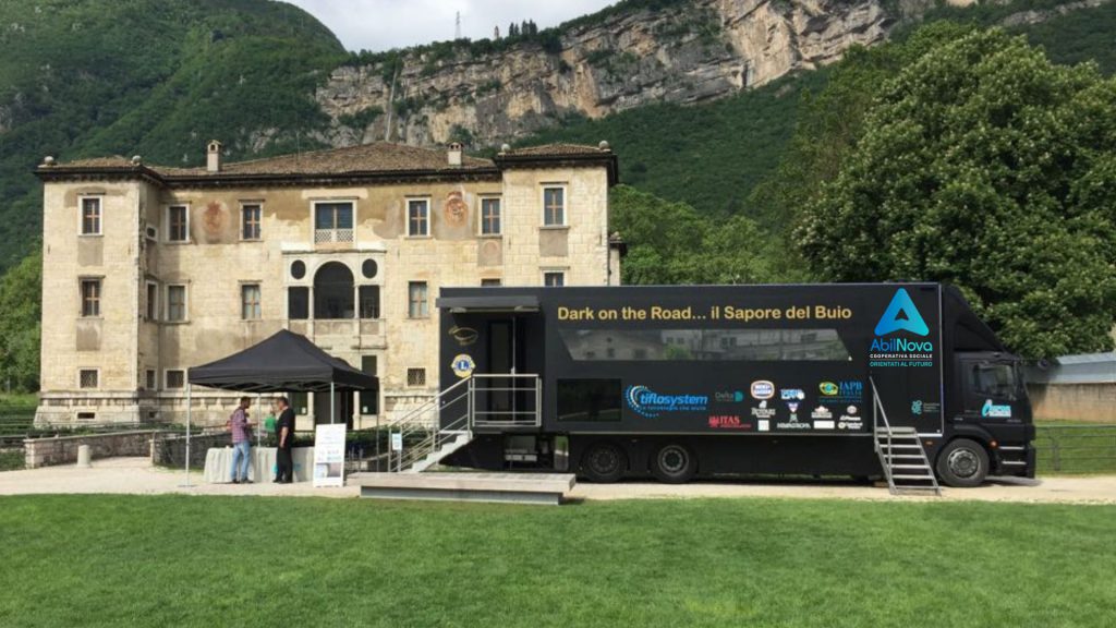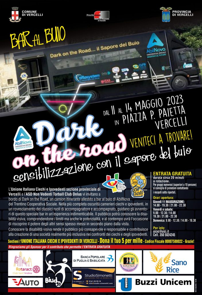 Dark on the Road è un camion, allestito a bar, di proprietà della cooperativa AbilNova di Trento, in grado di portare l’esperienza del buio su tutto il territorio nazionale, ideato per sensibilizzare la gente comune sulla difficoltà che attraversa quotidianamente chi non vede.