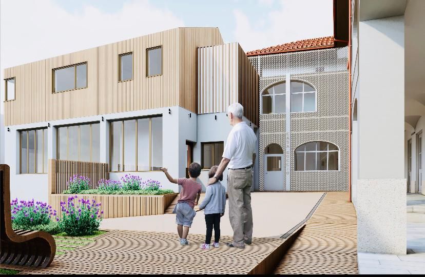 Il progetto: a “Casa Doccio” verranno realizzati due nuovi volumi accanto al corpo principale, in modo da poter realizzare spazi con diverse funzioni: il centro diurno Alzheimer, un centro di ricerca per lo sviluppo di ausili per la disabilità, uno spazio-laboratorio per bambini e ragazzi ed infine un’area per attività sportive.