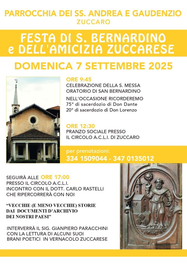 Si celebra domenica 7 settembre in frazione Zuccaro la festa di San Bernardino e dell’Amicizia zuccarese e si festeggerranno due anniversari di ordinazione sacerdotale: 75 anni di Don Dante e 20 anni del Parroco Don Lorenzo.