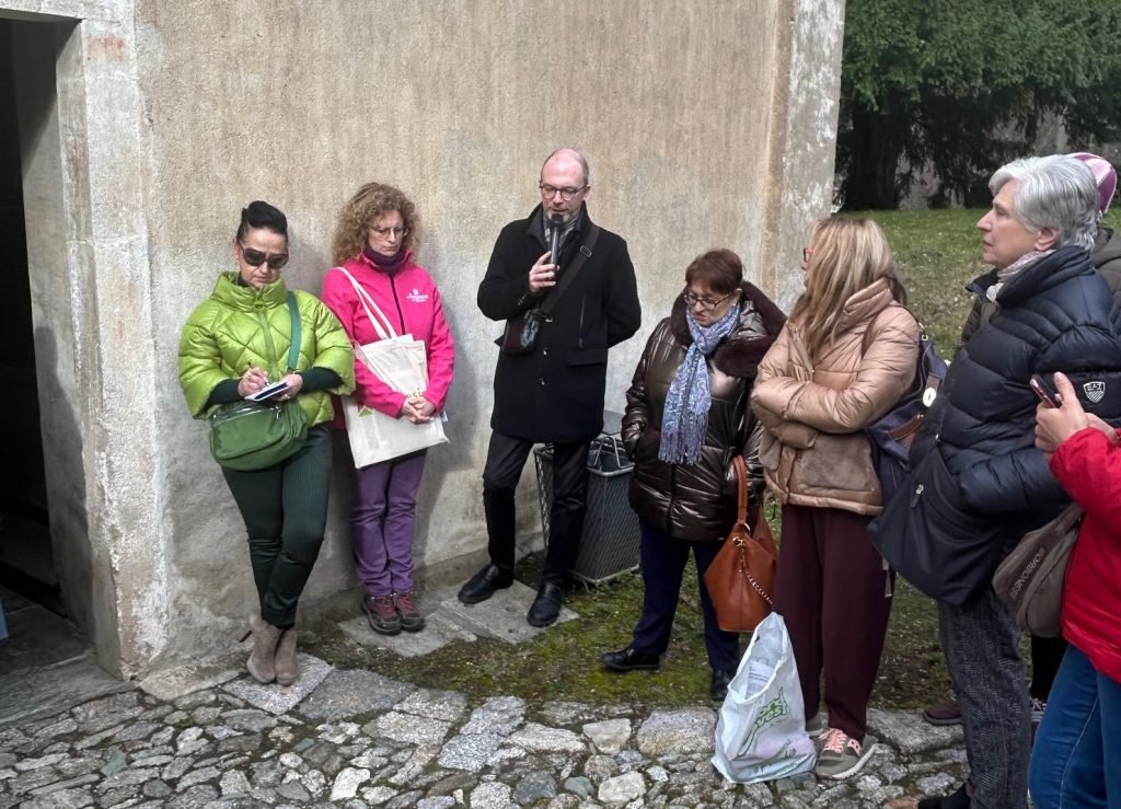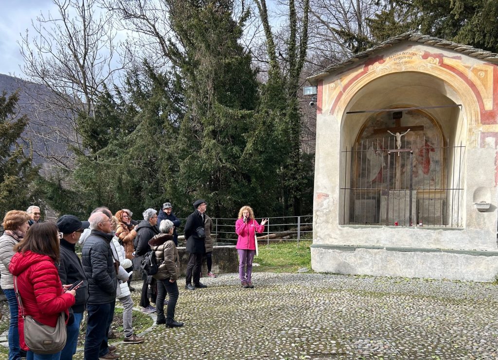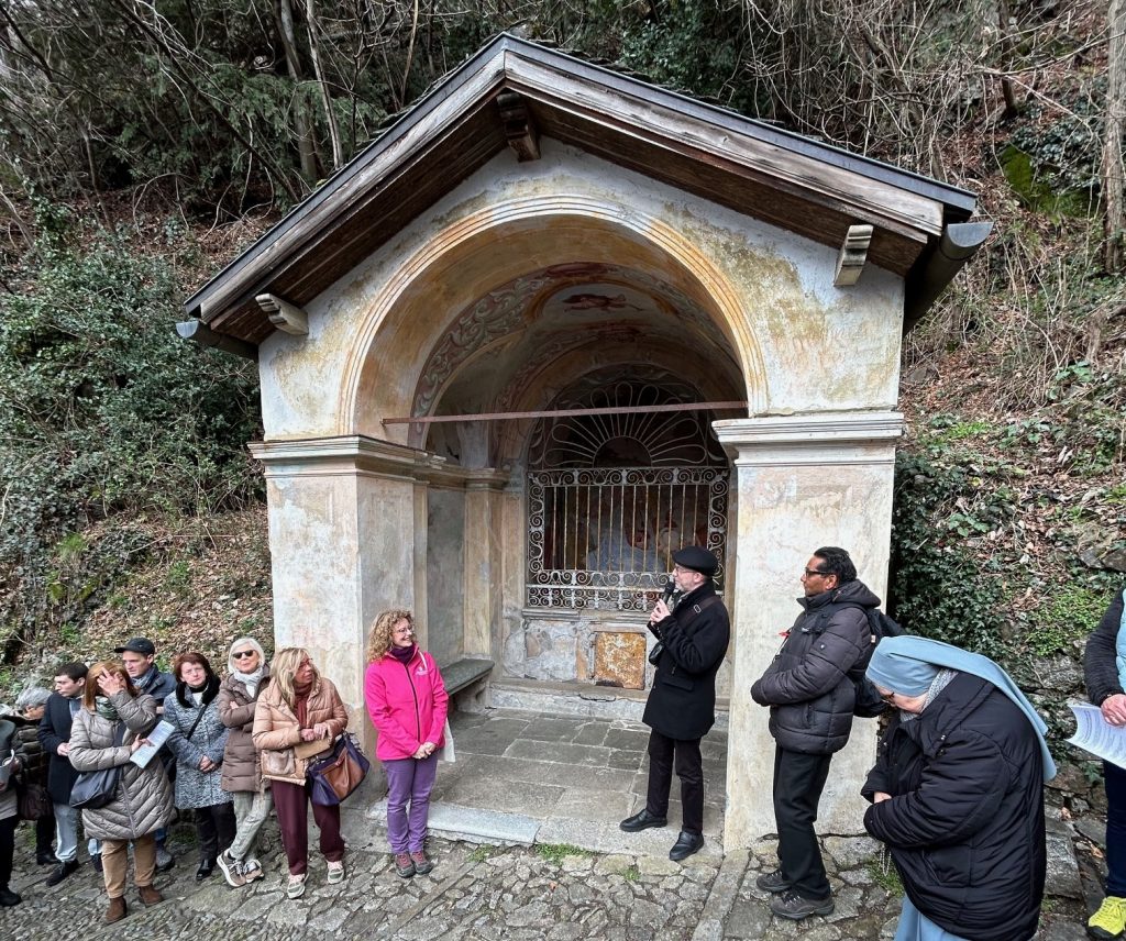 Monica Ingletti, guida turistica, ha illustrato brevemente il contesto storico e le vicende artistiche delle singole cappelle: “Sono lieta di accompagnarvi lungo un percorso che solitamente non si fa mai e che mi offre l’opportunità di parlarvi di artisti e artigiani di alto livello, ma che non vengono mai citati: Giacomo Valentini da Orta, Gian Giacomo Testa, Aurelio Luini, spesso confuso con Cesare Luini, sacerdote vicino al Sacro Monte, Cristoforo Martinolio detto Il Rocca, Bartolomeo Badarello da Campertogno, Gaudenzio e Bartolomeo Ravelli, che scolpirono le grate, Pietro Francesco Petera, Giovanni Soldo da Camasco, i fratelli Montalto, detti “Danedi” e naturalmente anche dei sommi artisti come Melchiorre d’Enrico, detto Tanzio, che partecipò a Roma al primo Giubileo, e Giovanni D’Enrico, massimo plastificatore del complesso”, poiché, come sottolineato dal Professor Don Damiano Pomi, varallese, oggi Parroco di Ghemme, che ha guidato le riflessioni spirituali: “Il Sacro Monte è stato realizzato dalle centinaia di persone che lo vissero come luogo di incontro con Dio, di conversione. Un’infinità di storie di vita si sono intrecciate al Sacro Monte, ma per scoprirle e gustarle bisogna prendersi tempo. Questo incontro offre anche l’occasione di ricordare i benefattori del Sacro Monte, coloro che con la loro generosità ne resero possibile l’edificazione ed i successivi ingrandimenti: dal ricordato Cesare Maggi a Matilde di Savoia, che finanziò la Cappella della resurrezione del figlio della vedova di Naim, alla comunità dei valsesiani residenti a Roma che finanziarono la Cappella della Samaritana, al nobile milanese Pomponio Rosso per la Cappella della Resurrezione di Lazzaro, ma anche il soldato alemanno ricordato nella cappella del Cristo Bianco”.