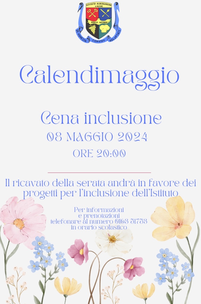 Il secondo appuntamento previsto per l’8 maggio alle ore 20.00 è “Calendimaggio”, una cena il cui ricavato andrà alla realizzazione dei progetti di inclusione dell’Istituto.