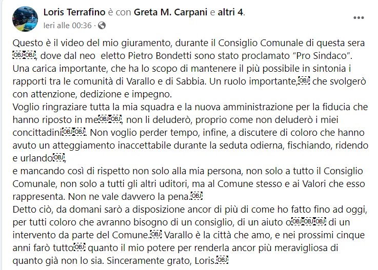 Alle contestazioni, il nuovo Pro Sindaco risponde così, il giorno seguente, dalla sua pagina Fb.