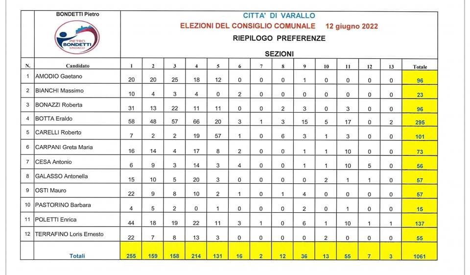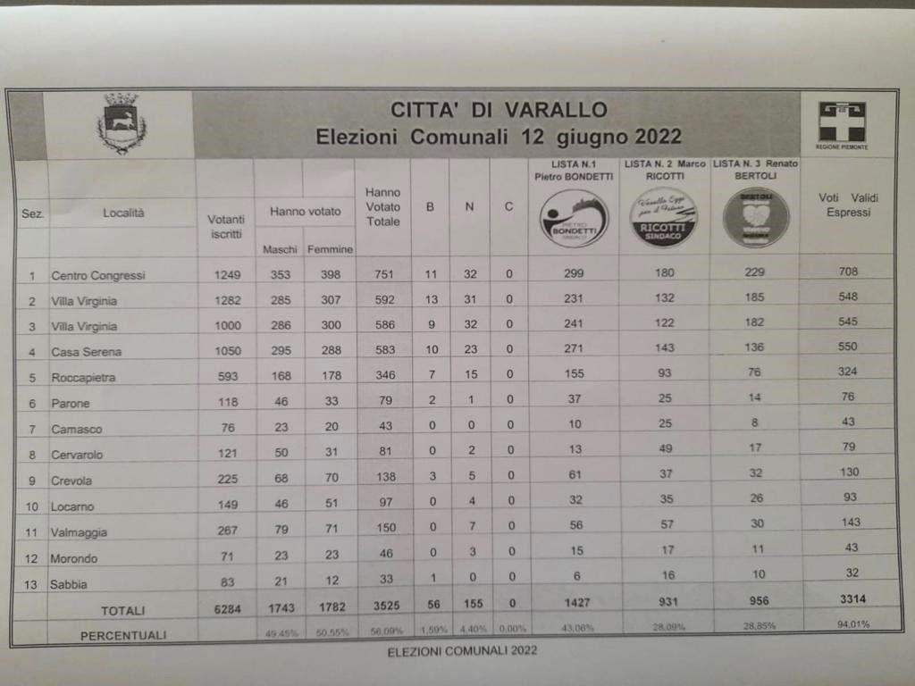 Proprio a Sabbia, i voti di lista hanno visto premiata la compagine di Ricotti (16 voti, mentre 10 a Bertoli e solo 6 a Bondetti).