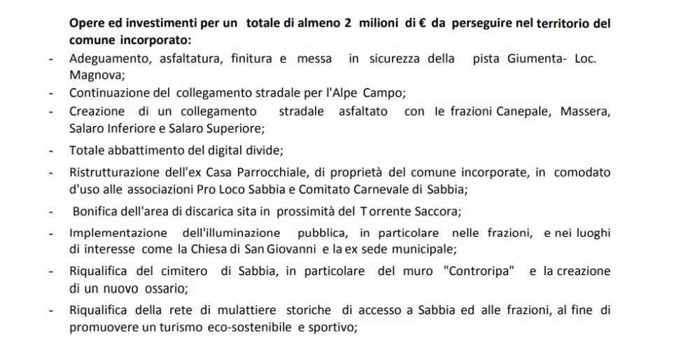 Come si potrà leggere nel testo, la fusione avrebbe dovuto (preferibilmente?) vedere realizzate opere pubbliche a beneficio del territorio di Sabbia, per un totale di 2 milioni, degli 11 da erogarsi.