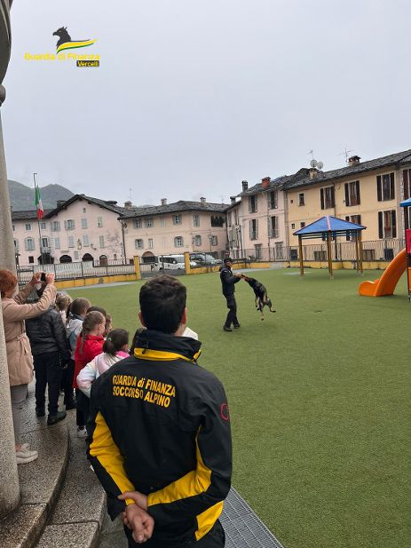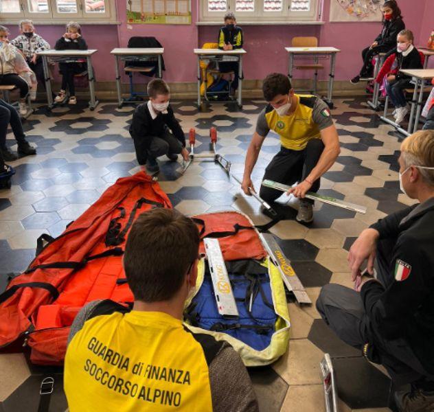 In queste prime settimane di maggio, i militari della Stazione S.A.G.F. (Soccorso Alpino della Guardia di Finanza) di Alagna Valsesia (VC) hanno fatto visita agli alunni della scuola elementare di Varallo e Roccapietra, su richiesta dei docenti, per illustrare i compiti di ricerca e soccorso in alta montagna della Guardia di Finanza e come “le Fiamme Gialle” siano sempre vicino a chi ha bisogno di aiuto quando versa in situazioni di pericolo.