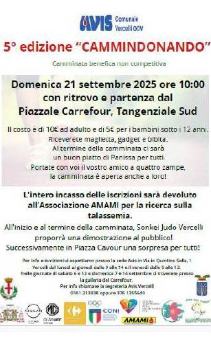 VERCELLI – 5^ edizione di “Cammindonando”, camminata benefica non competitiva dell’AvisIl ricavato sarà devoluto all’Associazione AMAMI per la ricerca sulla talassemia Lo Sport 29/08/202529/08/2025 Vercelli Città