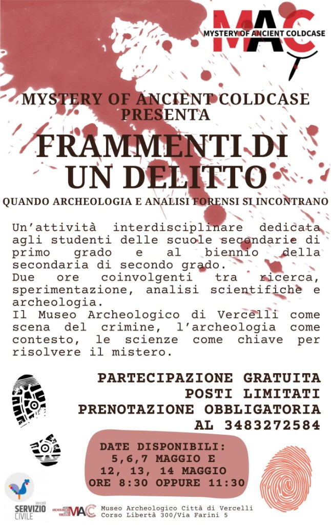 Per concludere nel migliore dei modi questo anno di Servizio Civile, con l’aiuto e la guida dei Servizi Educativi, Alessandro ha progettato una proposta di attività didattica per le scuole: nel prossimo mese di maggio “Mystery of Ancient Coldcase” presenterà quindi “Frammenti di un delitto”.