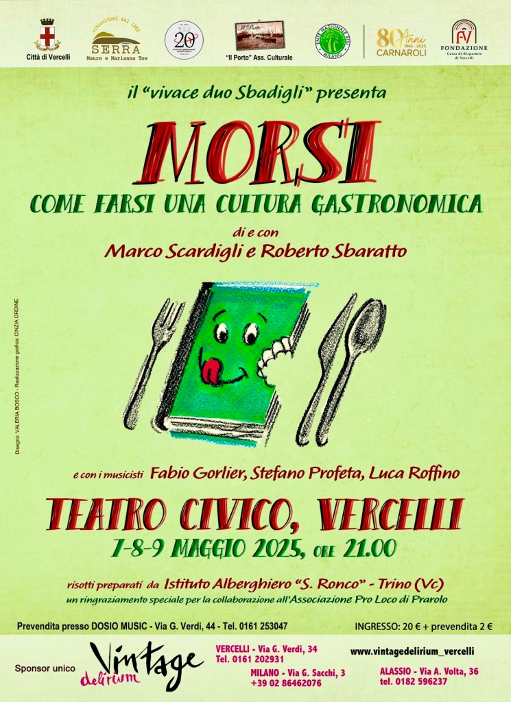 Il “Vivace Duo Sbadigli” (Roberto Sbaratto e Marco Scardigli), presenta al Teatro Civico di Vercelli “Morsi – come farsi una cultura gastronomica”.