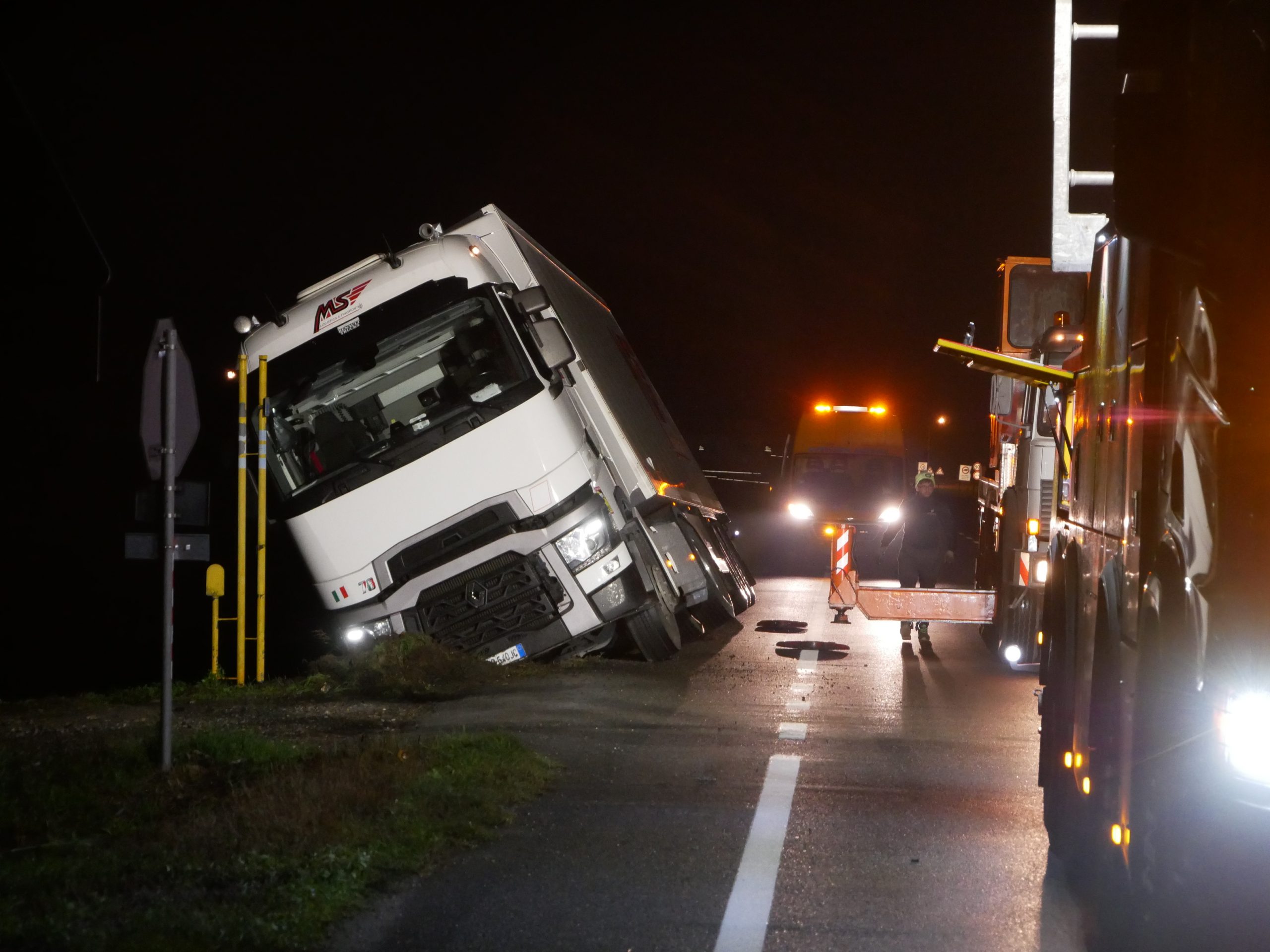 VERCELLI / BORGO VERCELLI - Due incidenti stradali nel tardo pomeriggio di oggi, 17 ottobre, a poco distanza l'uno dall'altro - Camion fuori strada tra la Cascina Ranza e l'incrocio per Palestro - Auto nel fosso dopo il cavalcavia prossimo all'ingresso del paese, verso il bivio per Villata e l'innesto della tangenziale -