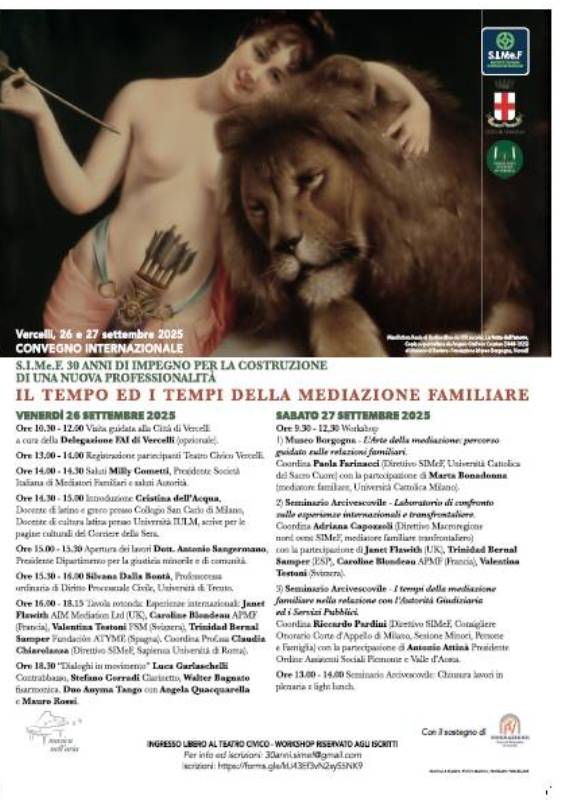 In occasione della celebrazione dei 30 anni di attività, la Società Italiana di Mediatori Familiari, di cui mi onoro essere presidente, organizza il Convegno Internazionale “S.I.Me.F. 30 anni di impegno per la costruzione di una nuova professionalità. Il Tempo ed i tempi della Mediazione Familiare”, che si terrà a Vercelli il 26 e 27 settembre 2025.