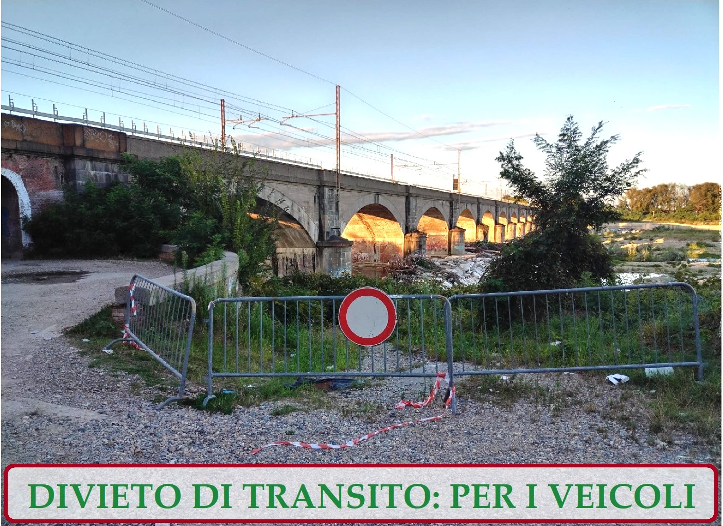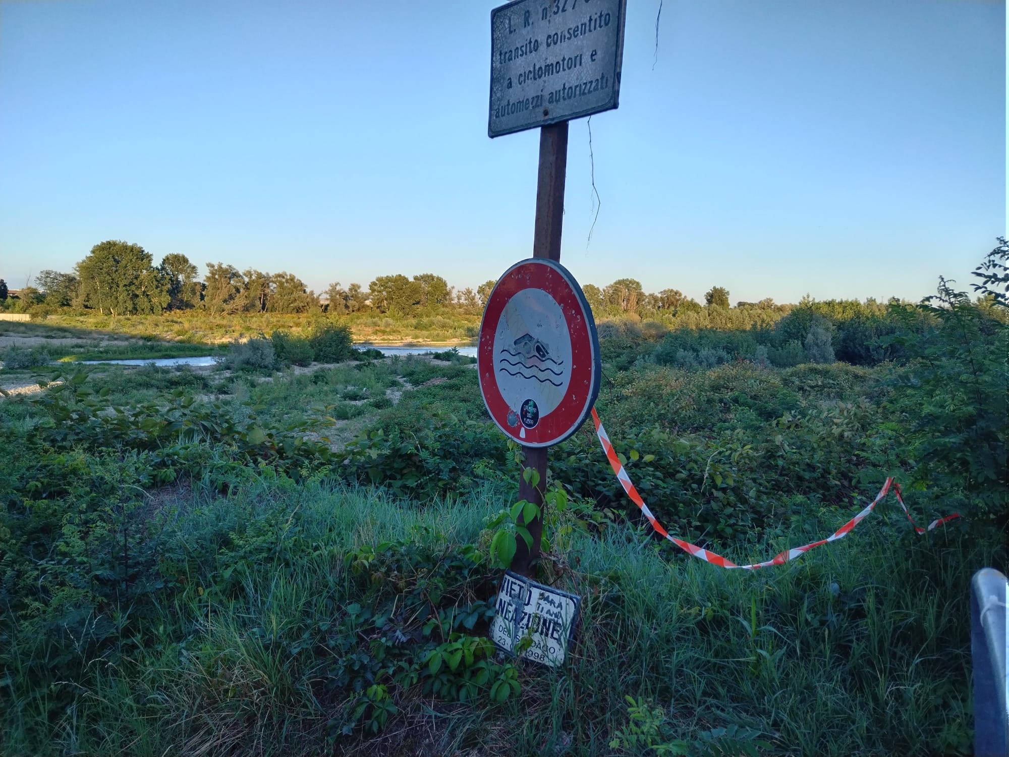 Il sentiero che dall’argine scende verso il greto, superando i cubi di cemento armato a difesa delle sponde, è sbarrato da transenne metalliche, guarnite di una segnaletica verticale – un cartello di divieto di transito – che, secondo il mai mutato Codice della Strada, significa: qui i veicoli non passano.