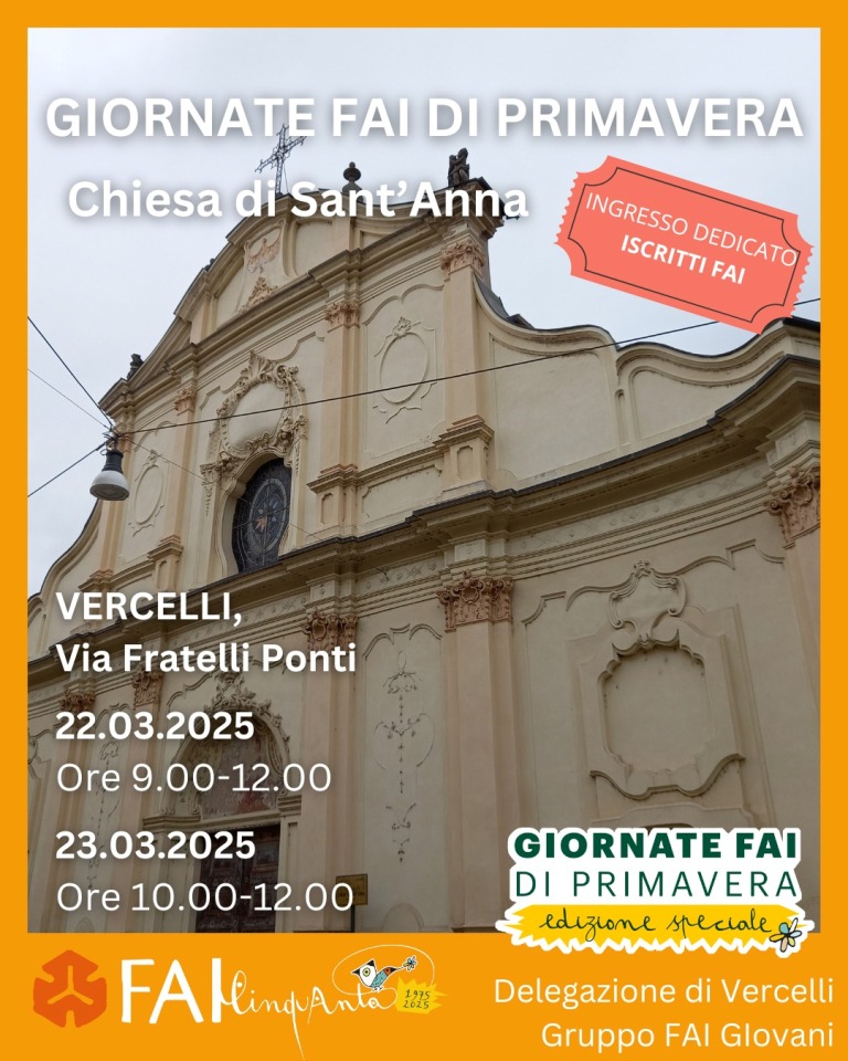 A breve distanza dal Salone, ma solo per gli iscritti FAI o per coloro che vorranno fare la tessera in loco, sabato 22 marzo dalle 9 alle 12 apriremo per le visite guidate la chiesa di Sant’Anna, da tempo chiusa al pubblico per i restauri che si sono appena conclusi. I nostri volontari vi accoglieranno in Sant’Anna anche domenica, dalle 10 alle 12, per raccontarvi qual è il collegamento con il quartiere della Furia oltre che per illustrare i gioielli pittorici custoditi all’interno dell’edificio.