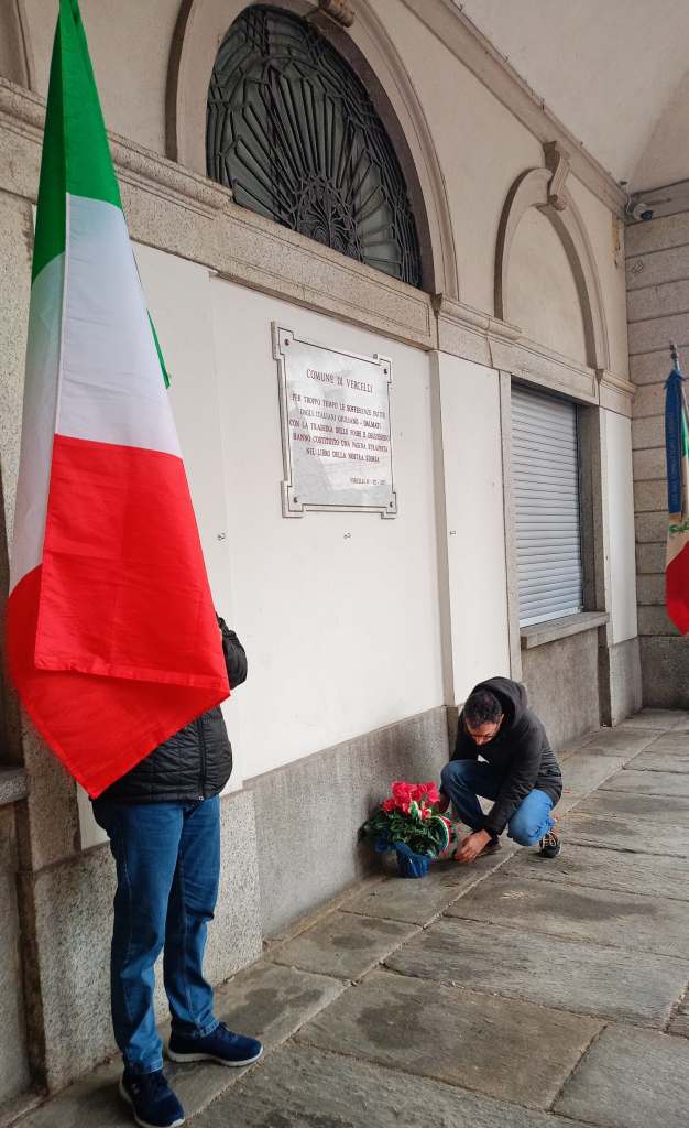 Nel pomeriggio di sabato 8 febbraio 2025 la sezione vercellese del Comitato 10 Febbraio, insieme a rappresentanti delle associazioni d’Arma e abitanti di Vercelli, ha deposto un vaso di fiori in omaggio alle vittime delle Foibe presso la targa situata nei pressi del Municipio.