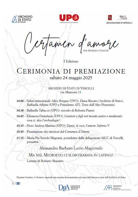 Ancora un prestigioso appuntamento proposto dalla Associazione di Cultura ClassicaVERCELLI – “Certamen d'Amore” per Roberta Piastri con lectio magistralis di Alessandro BarberoL’evento si svolgerà presso l'Archivio di Stato Cultura e Spettacolo 13/05/202514/05/2025 Vercelli Città