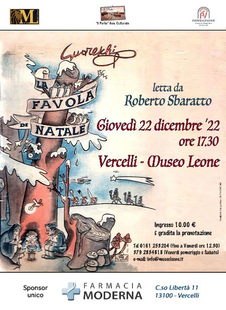 La voce di Roberto Sbaratto si farà interprete di questo dolcissimo racconto natalizio, giovedì pomeriggio, 22 dicembre, alle 17.30, nella sala delle Cinquecentine del Museo Leone, con un grazie particolare alla Farmacia Moderna che ha voluto dare un contributo per la realizzazione dell’Evento, insieme alla Fondazione Cassa di Risparmio di Vercelli.