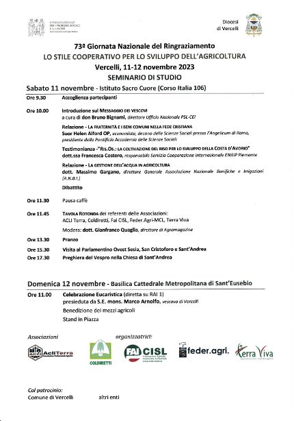 Saranno due giorni intensi, sabato 11 novembre alle ore 09:30 è in programma l’inizio di un Seminario di studio presso l’Istituto Sacro Cuore di Vercelli in Corso Italia 106, organizzato dalla CEI (Conferenza Episcopale Italiana), da ACLI Terra nazionale, da Coldiretti e dalle maggiori sigle sindacali legate al mondo dell’agricoltura, con il patrocinio del Comune di Vercelli.
