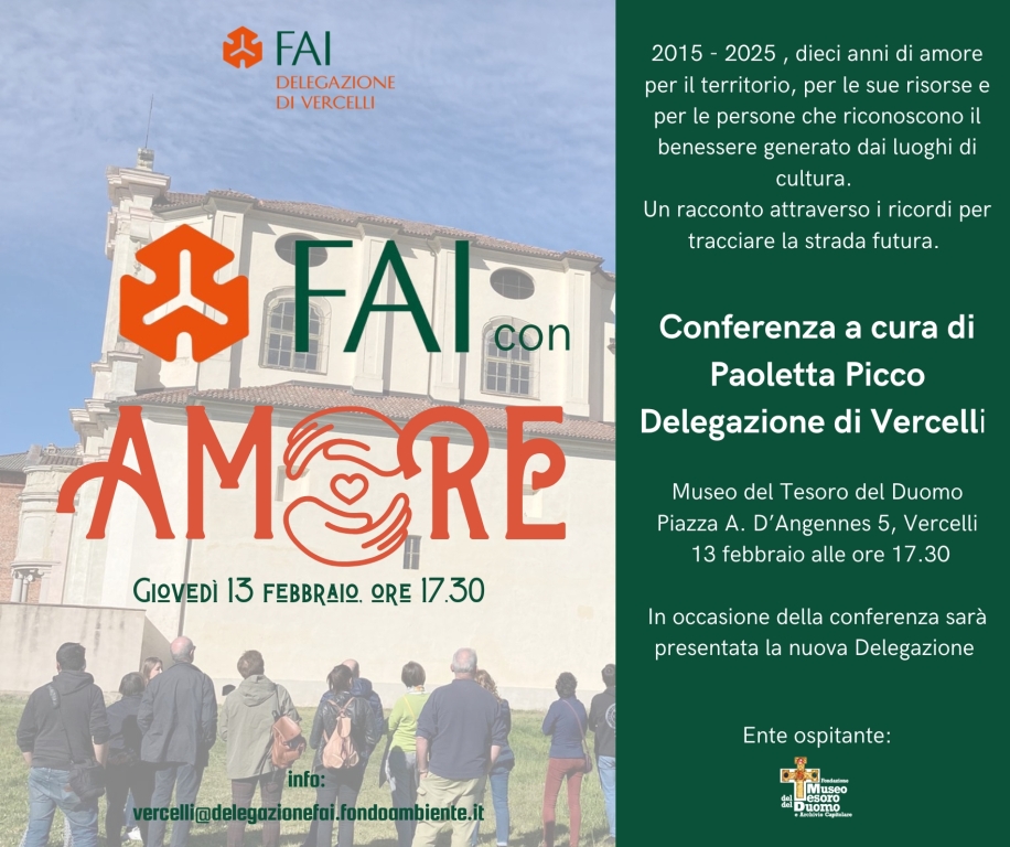 In occasione del passaggio di consegne si svolgerà l’evento FAI con amore, con una conferenza della professoressa Picco volta a ripercorrere le iniziative della Delegazione vercellese che, negli anni, ha assicurato grandi aperture, momenti didattici, esperienze di visita vissute in luoghi pubblici e privati sotto l’egida del FAI.