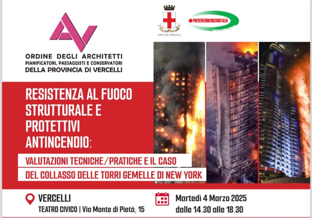 “Resistenza al fuoco strutturale e protettivi antincendio: valutazioni tecniche/pratiche e il caso del collasso delle Torri Gemelle di New York”: è il tema dell’incontro aperto al pubblico, organizzato dall’Ordine degli Architetti P.P.C di Vercelli in collaborazione con il Comune di Vercelli e con PrevenzioneIncendItalia.