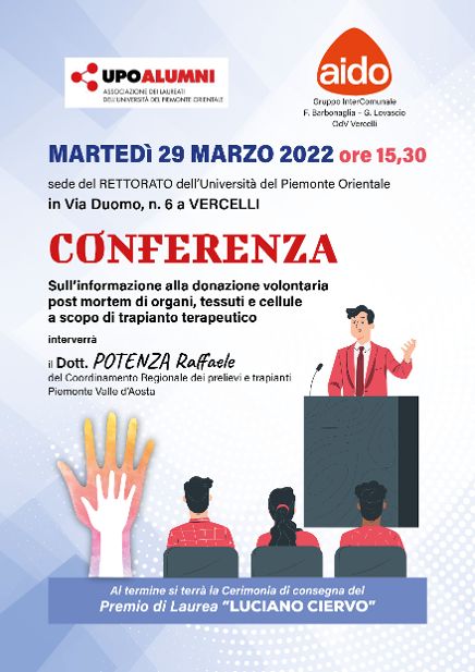 il giorno 29 marzo 2022 alle ore 15,30 presso la sede del Rettorato dell’Università del Piemonte Orientale, via Duomo 6, Vercelli, si terrà la conferenza sull’informazione alla donazione volontaria post mortem di organi, tessuti e cellule a scopo di trapianto terapeutico, ed interverrà il dott. Potenza Raffaele del Coordinamento Regionale dei Prelievi e Trapianti Piemonte e Valle d’Aosta, infine si terrà la cerimonia di consegna del premio di laurea A.I.D.O. “Luciano Ciervo” alla presenza dei volontari A.I.D.O. del gruppo InterComunale OdV Vercelli, della rappresentanza degli alpini di Prarolo/Vercelli e la famiglia del compianto Luciano Ciervo nelle persone di Elena Mancino (la madre) e Gabriella Lupolo (la moglie).