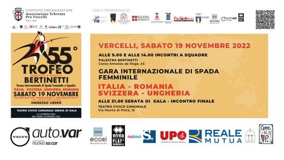 L’Associazione Scherma Pro Vercelli ha il piacere di presentare il 55°Trofeo Marcello e Franco Bertinetti, Torneo internazionale di spada a squadre per la seconda volta al femminile con: Italia, Romania, Svizzera E Ungheria.