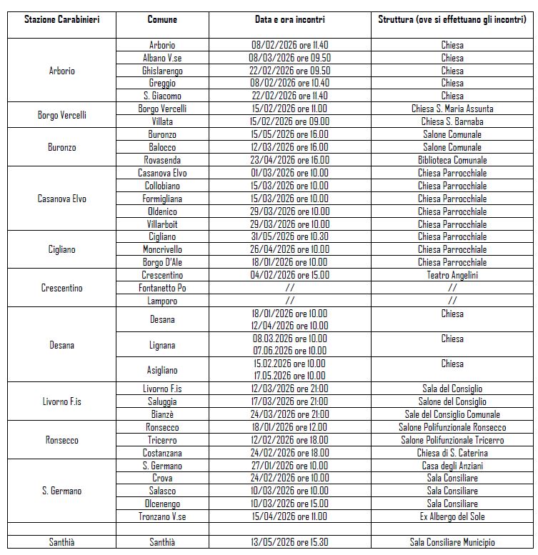 Alla luce della partecipazione registrata, il Comando Provinciale Carabinieri di Vercelli comunica il nuovo calendario di incontri tra cittadini e Forze dell’Ordine, che proseguiranno nei prossimi mesi con l’obiettivo di rafforzare la consapevolezza sui rischi legati alle truffe e promuovere comportamenti prudenti ed adeguati in caso di contatti sospetti e /o richieste anomale.
