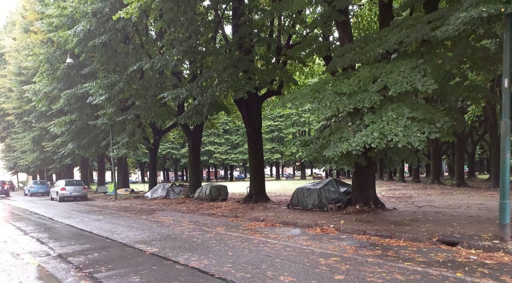 Attualmente non hanno un altro posto dove andare a ripararsi, a parte i portici e le loro cose sono ammonicchiate sotto gli alberi.