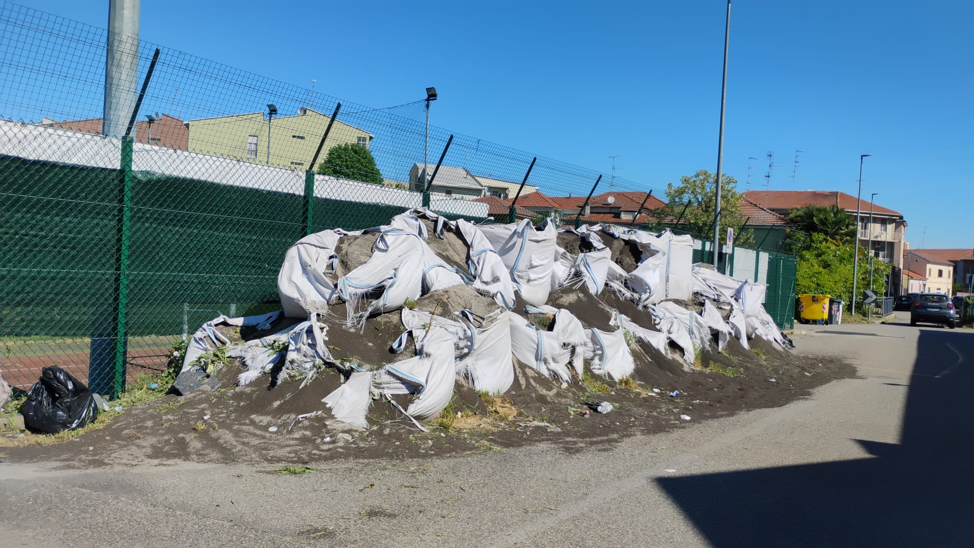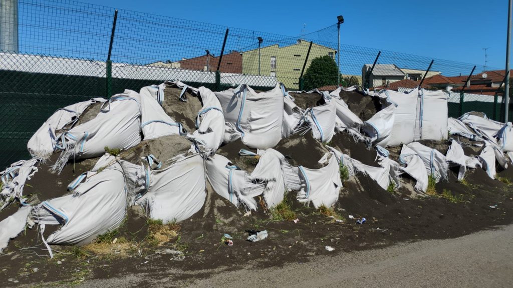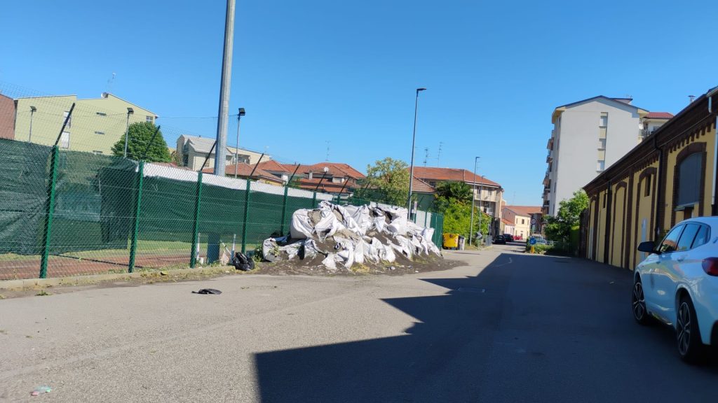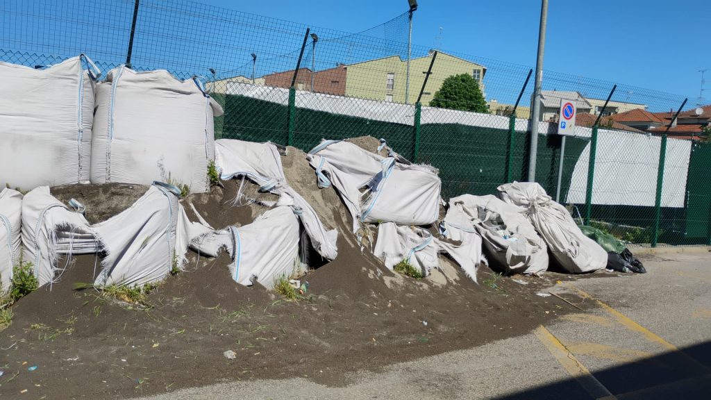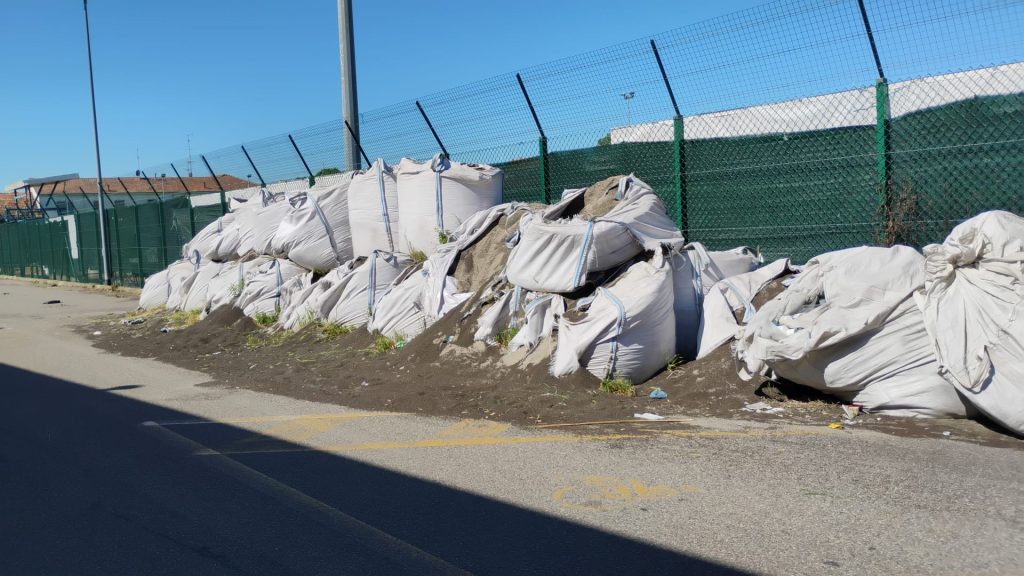 da informazioni acquisite dai residenti del Belvedere, probabilmente a seguito dei lavori di manutenzione del Centro Sportivo Mario Ardissone, sono stati ammassati all’esterno del campo e appoggiati alla recinzione di via Vicenza su suolo pubblico, decine di sacchi di materiale plastico presumibilmente un tempo parte del campo sintetico di gioco (come da fotografie allegate);