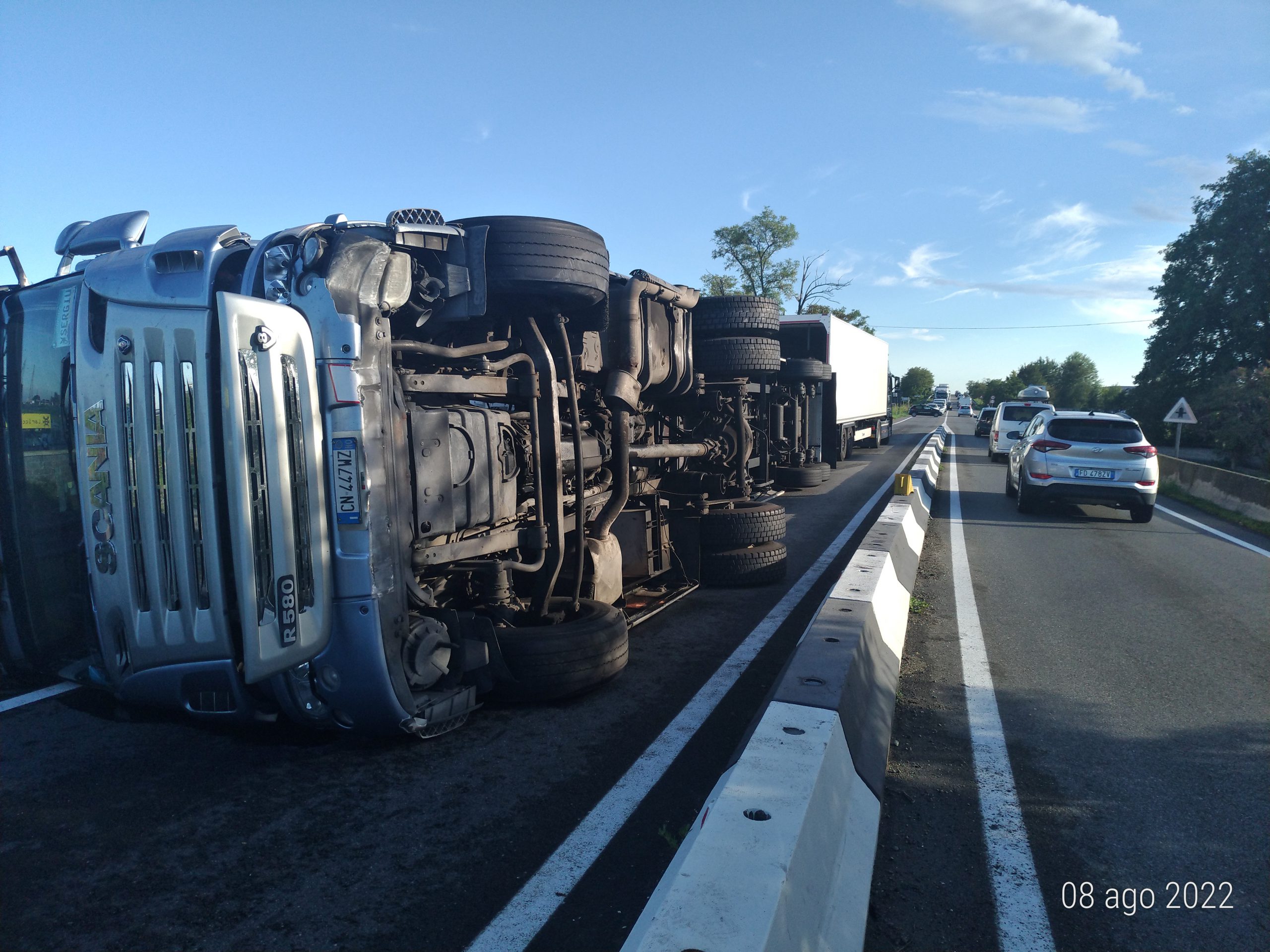 VERCELLI ROTONDA PER TORINO - Autoarticolato si rovescia - Traffico in tilt - Si tratta dell'ennesimo sinistro "autonomo", che vede, cioè, coinvolto un solo veicolo