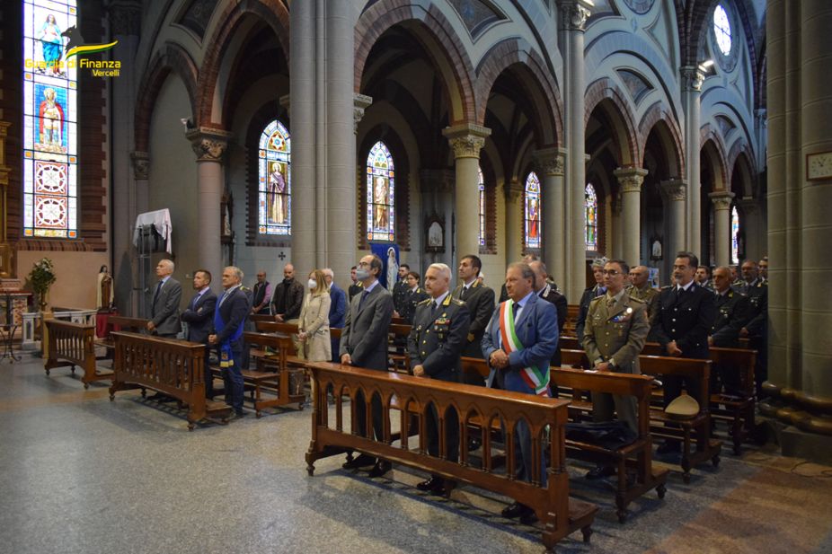 La liturgia eucaristica è stata officiata nella suggestiva chiesa del Sacro Cuore di Gesù dell’Arcidiocesi di Vercelli da Don Augusto Scavarda alla presenza di S.E. il Prefetto, Dott. Lucio Parente, e delle altre massime Autorità civili e militari della Provincia che hanno voluto condividere il significativo momento spirituale insieme alla nutrita rappresentanza dei Finanzieri di ogni ordine e grado in servizio a Vercelli e del personale in congedo con il labaro dell’Associazione Nazionale Finanzieri d’Italia.
