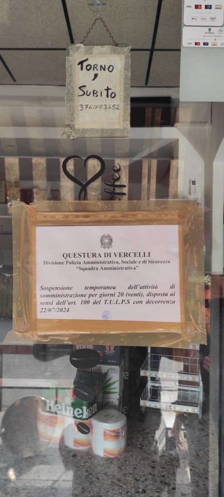Nella giornata di ieri, la Divisione Polizia Amministrativa della Questura di Vercelli, ha notificato un provvedimento di sospensione dell’attività ai sensi dell’art.100 TULPS al proprietario del BAR SUPREME di Via Monviso per un periodo di 20 giorni in quanto teatro di numerosi eventi – caratterizzati anche da azioni violente – che creavano turbativa all’ordine ed alla sicurezza pubblica, ed inoltre in quanto abituale ritrovo di persone gravate da precedenti penali e di Polizia.