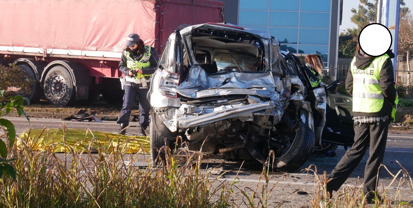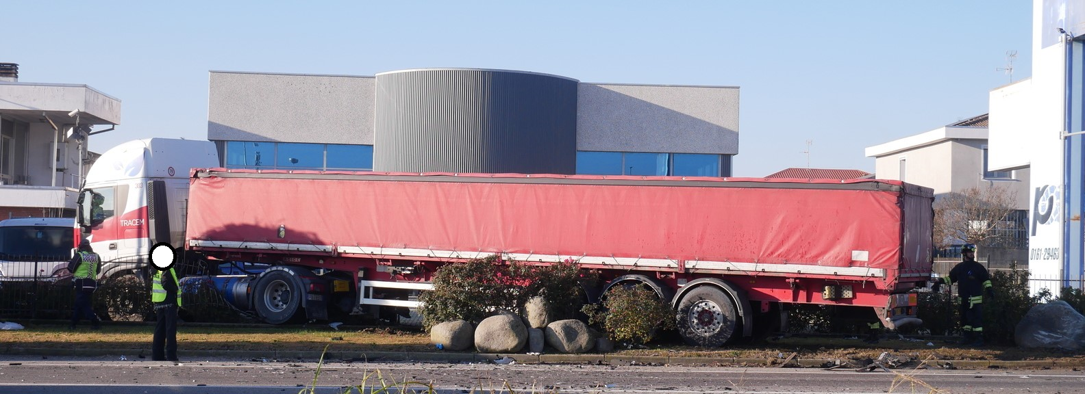 Per cause che sono al vaglio della Polizia Locale di Vercelli, tempestivamente intervenuta sul posto insieme ai Vigili del Fuoco, la vettura grigia che si vede nelle illustrazioni è entrata in collisione con i due mezzi pesanti, un autoarticolato ed un mezzo d’opera.